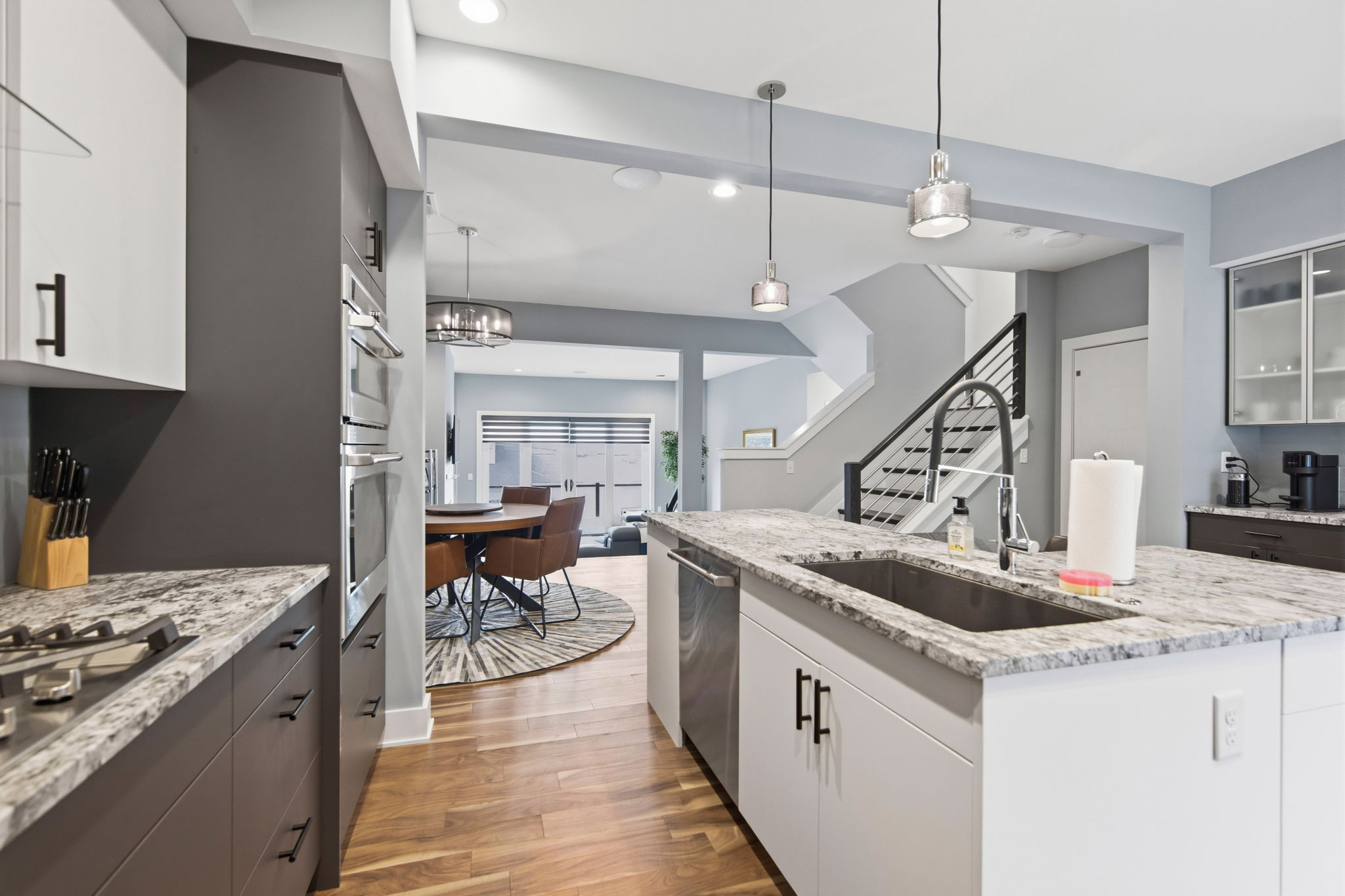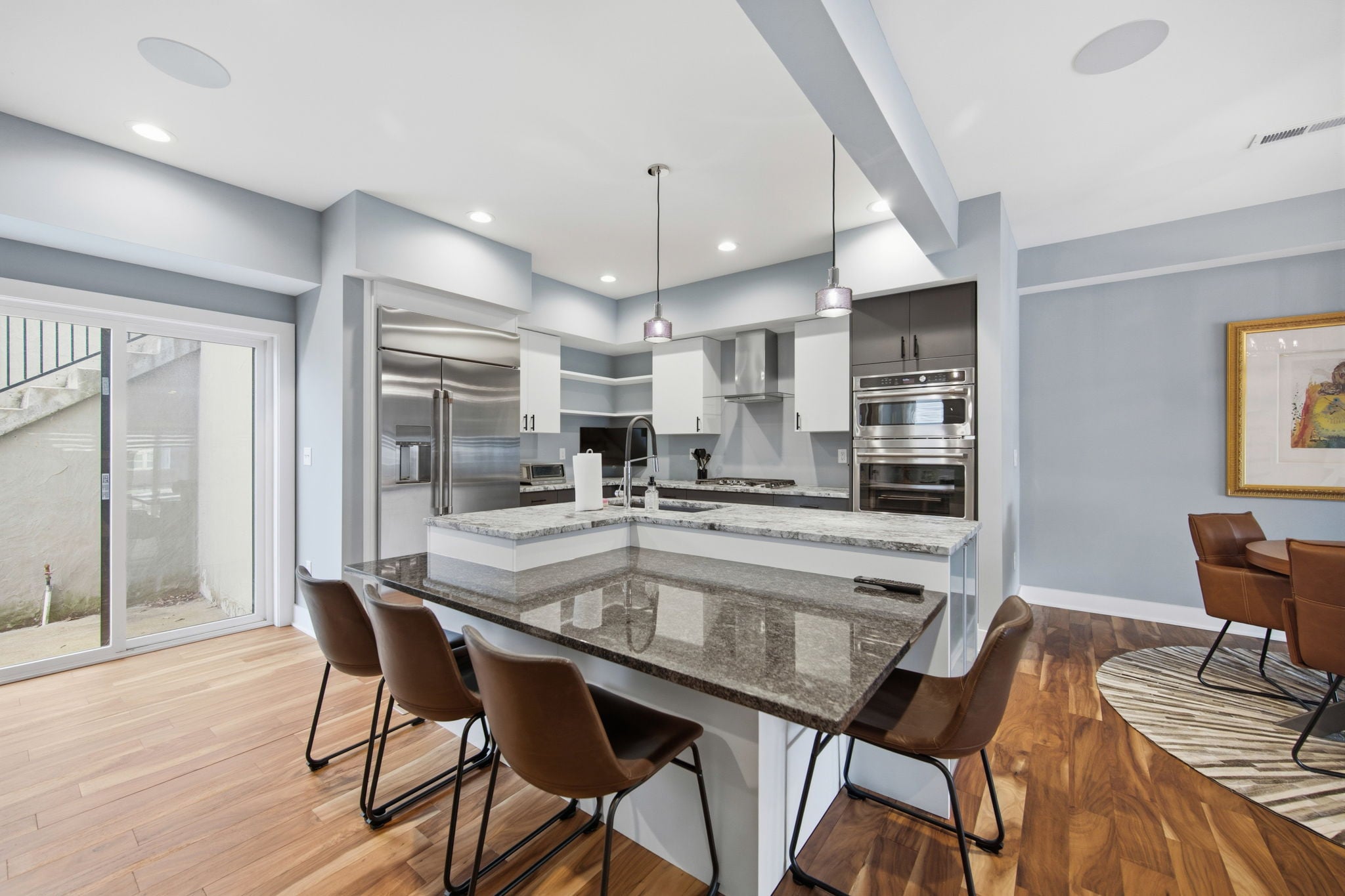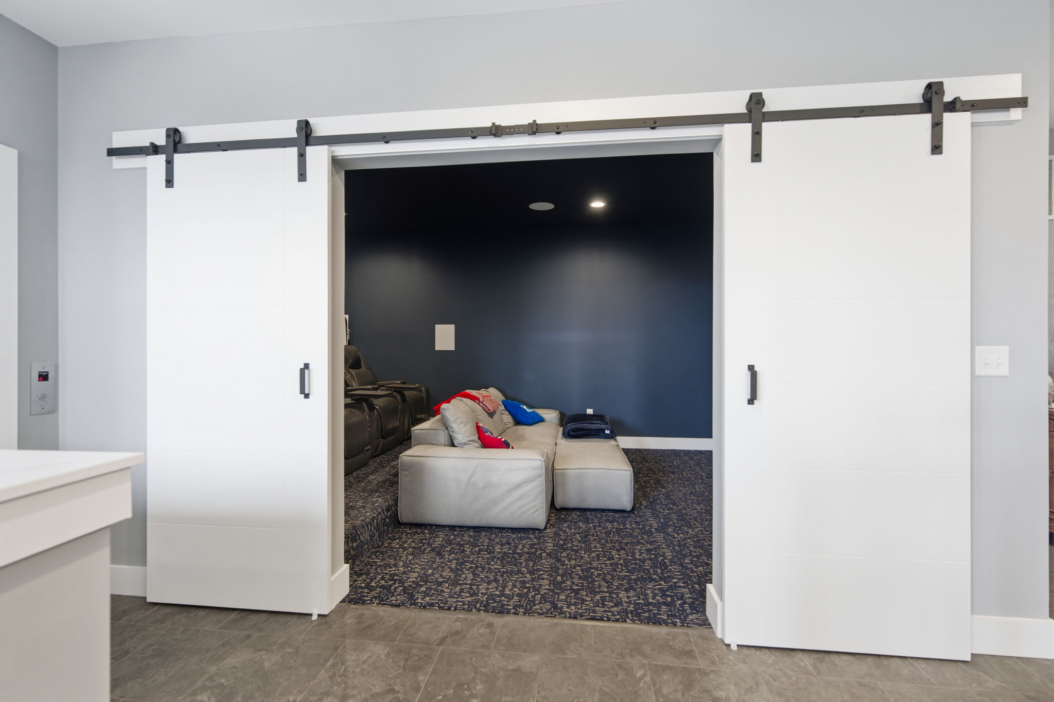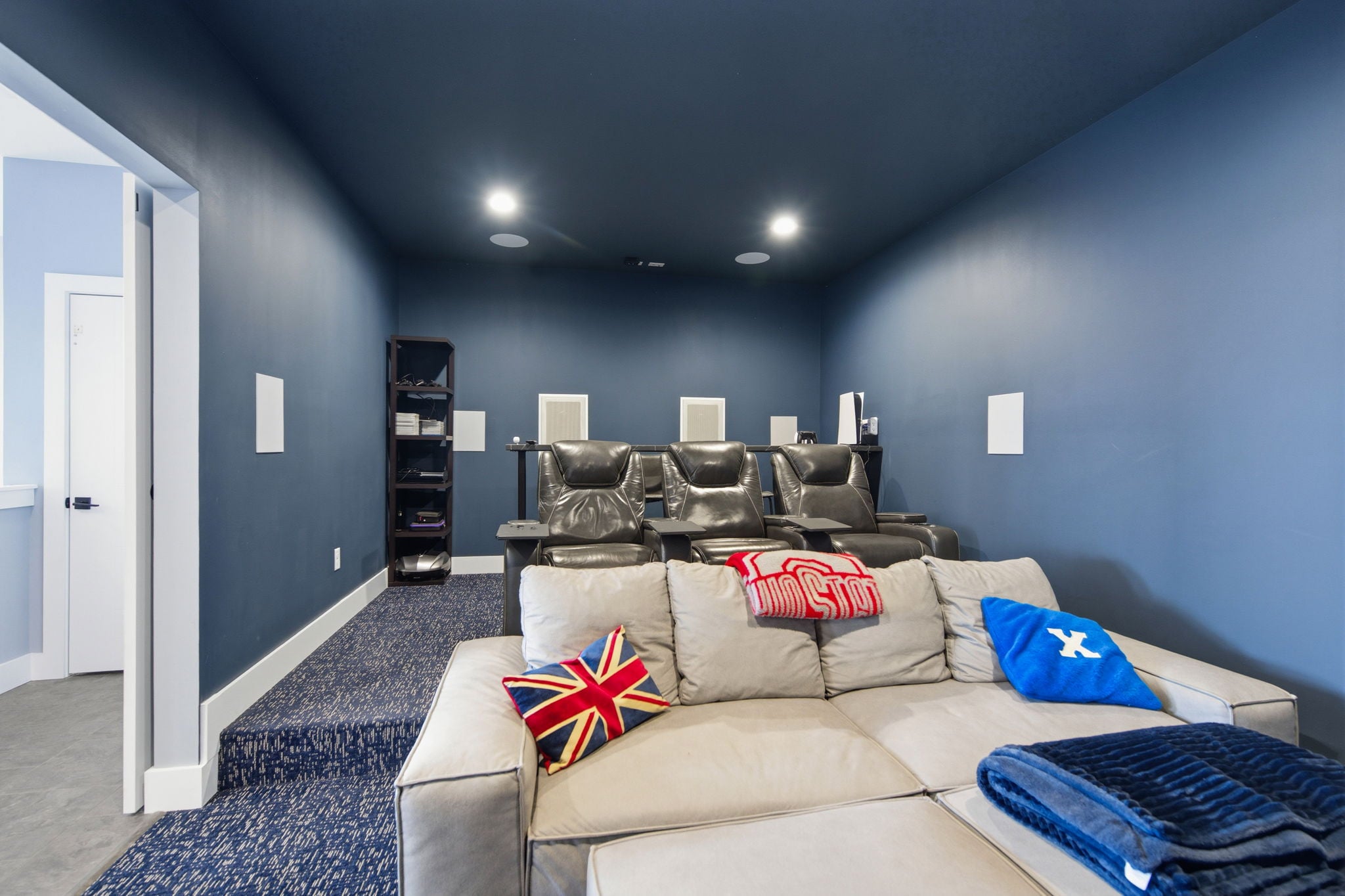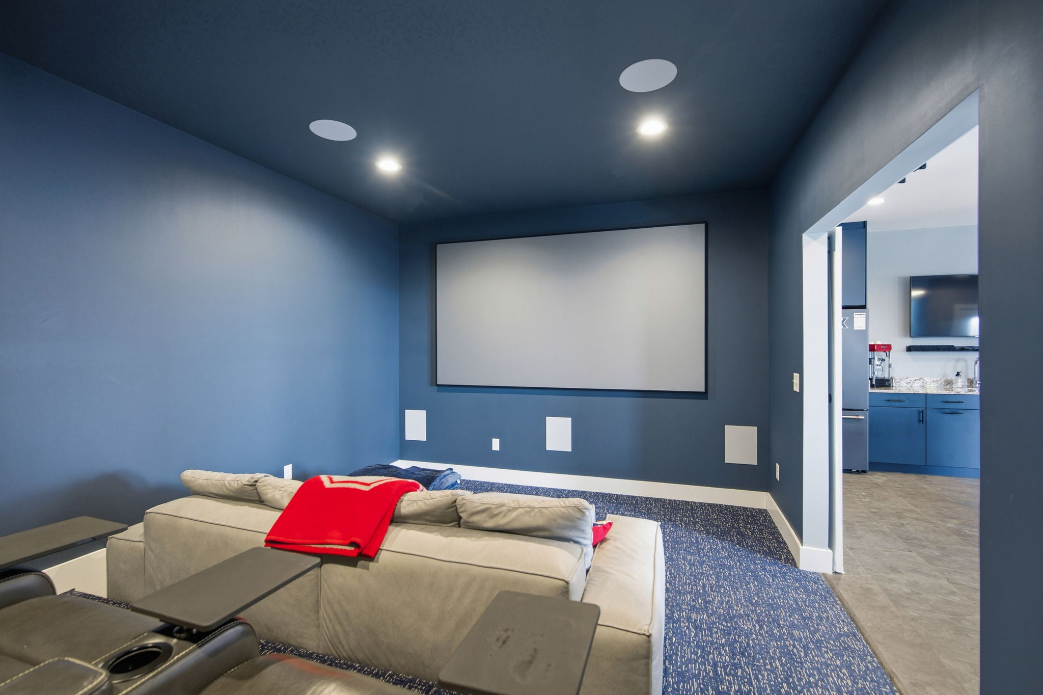 The open-concept main living areas flow seamlessly, enhanced by built-in speakers throughout and a dedicated home theater setup, creating the perfect environment for gatherings or relaxing nights in.