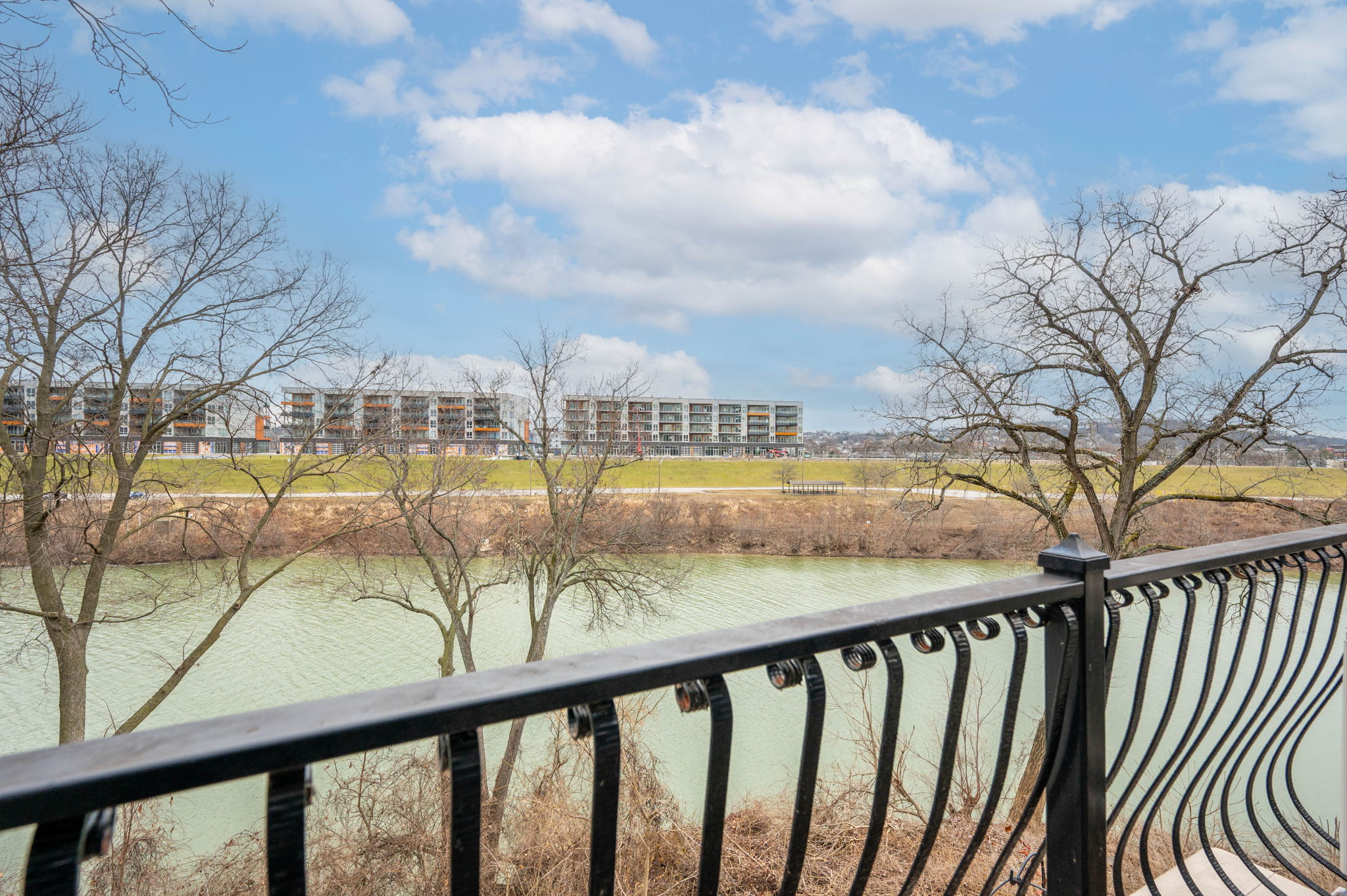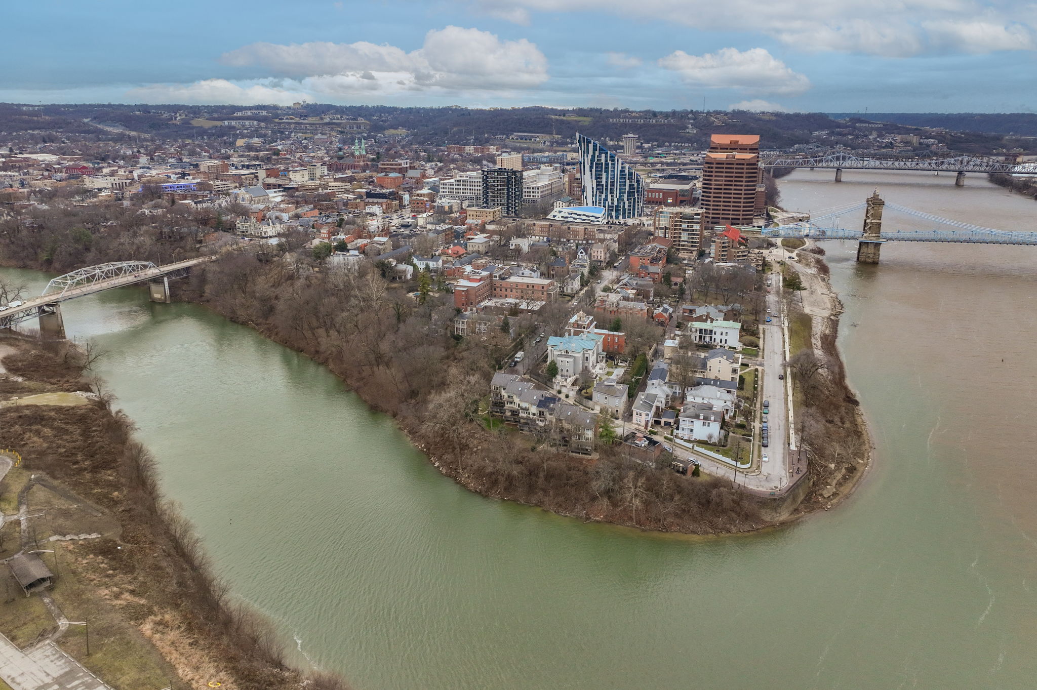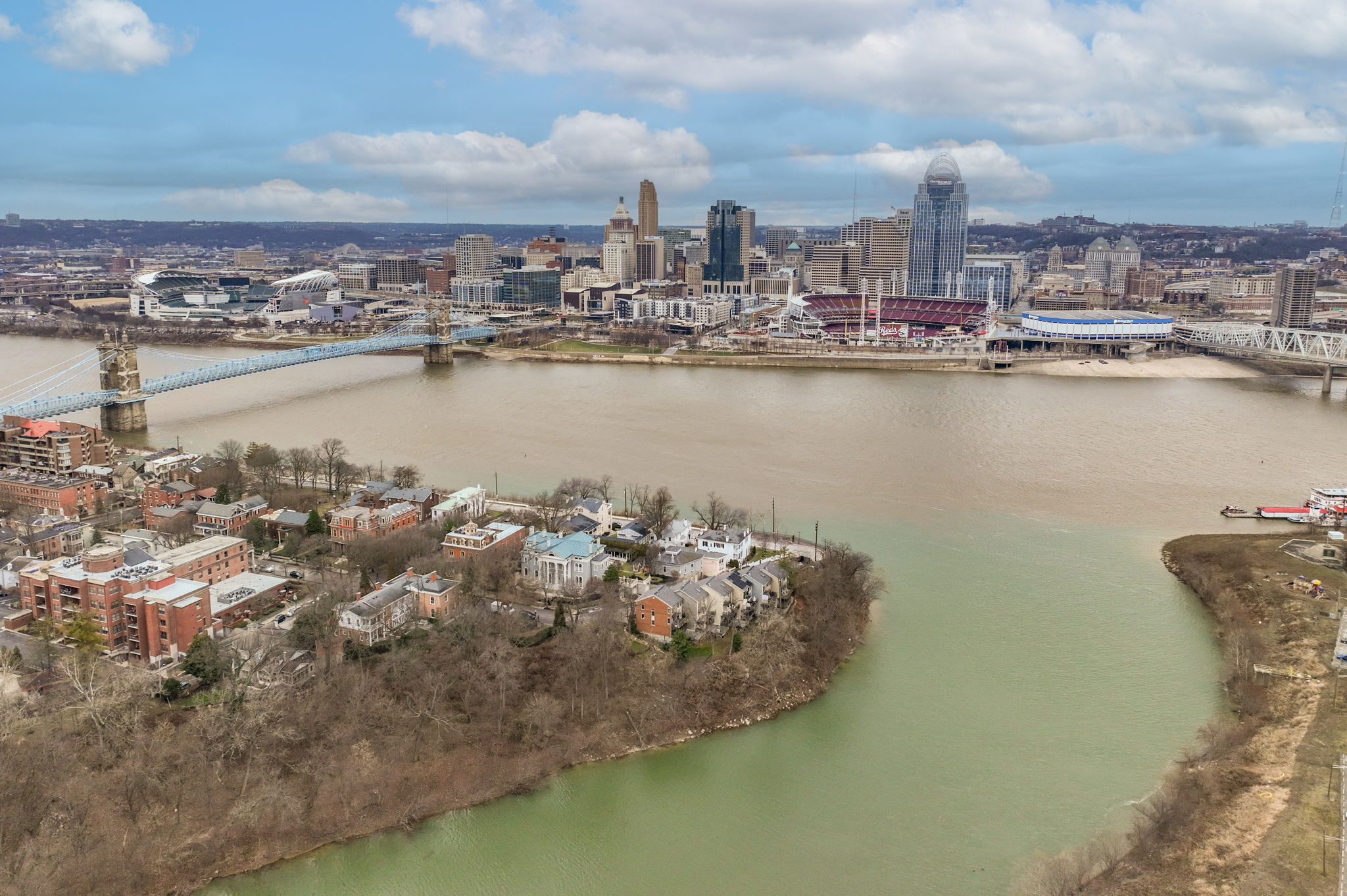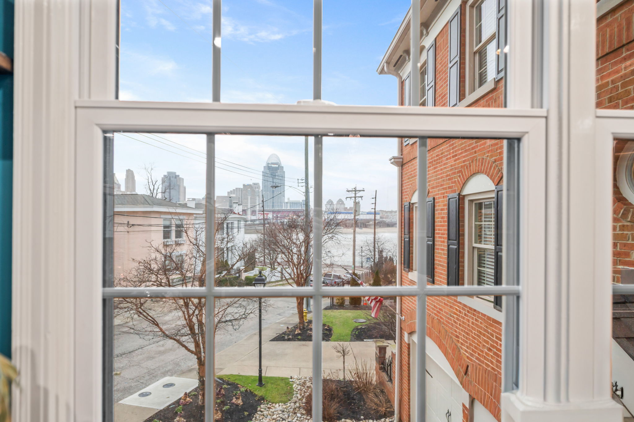 Poised along the riverbank in Covington's coveted Historic Licking Riverside District, this exceptional three-story townhouse offers some of the most breathtaking views in the tristate! From the moment you enter the foyer, a soaring ceiling sets the tone for a home that is equal parts dramatic and refined. The flexible office space stands out with exposed brick and a classic tin ceiling, while the updated kitchen features modern stainless steel appliances and a charming breakfast nook that walks out to one of three expansive decks, each level offering direct outdoor access and unforgettable views. Additional deck underside- roofing updates ensure year-round and all-weather enjoyment. The converted fireplace burns both wood and gas and is accented by a custom mantle, creating a cozy yet stylish focal point. Upstairs, spacious third-floor bedrooms include a stunning primary suite with river and city views, a bay window, modern tiled ensuite bath, and dual shower heads. With three tiers of decking, incredible natural light, and a truly irreplaceable location, this home is a rare opportunity to own a front-row seat to one of the most iconic views in the region.