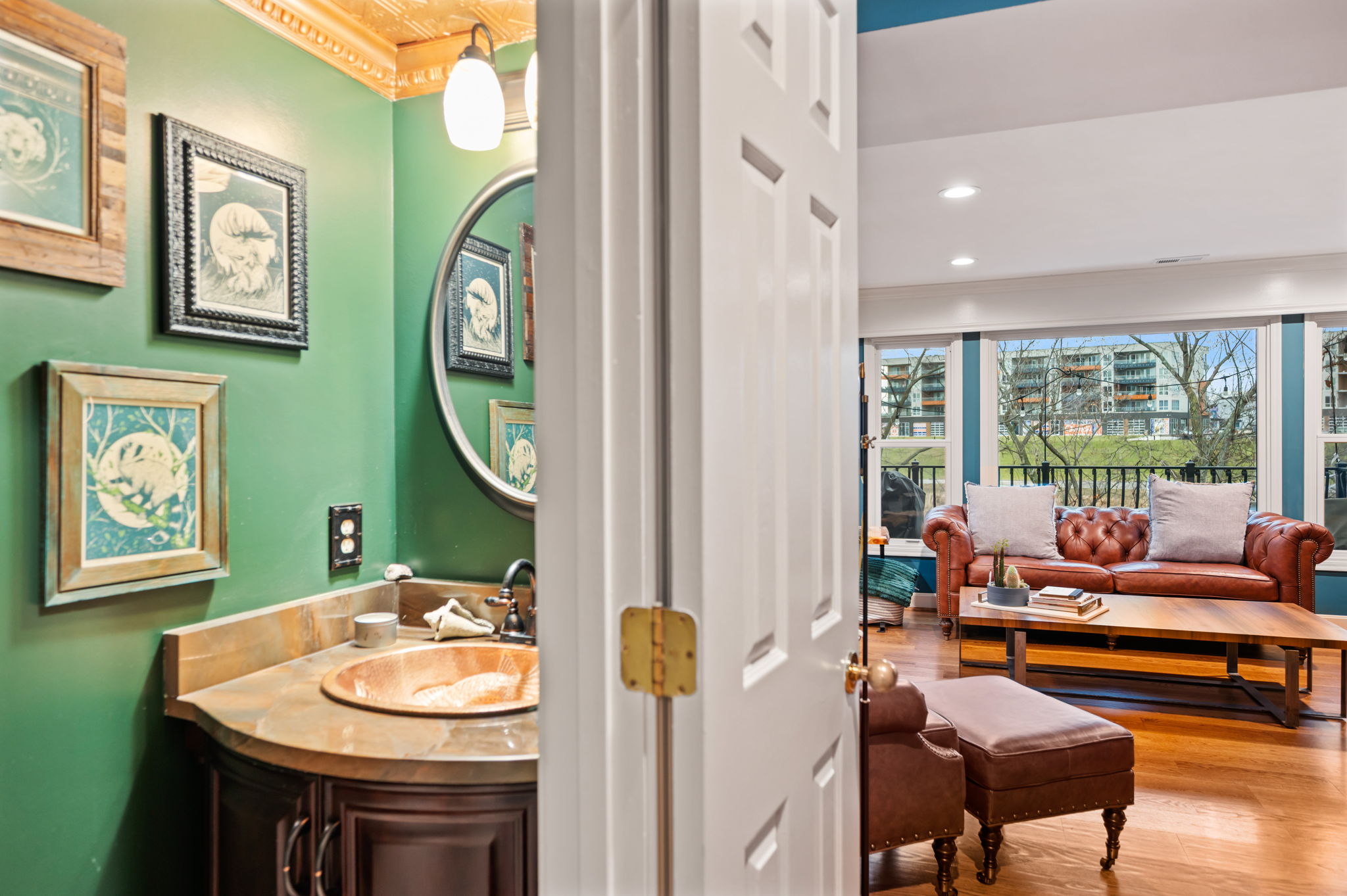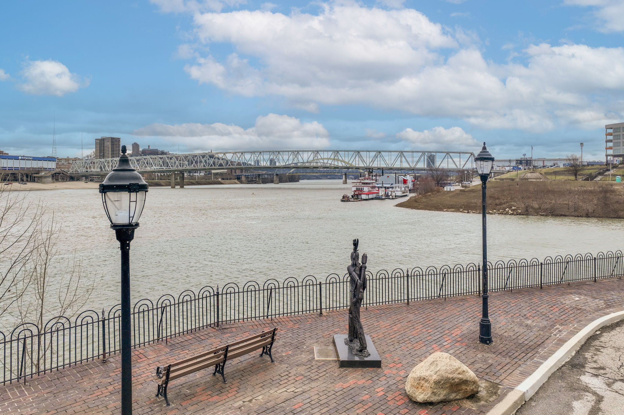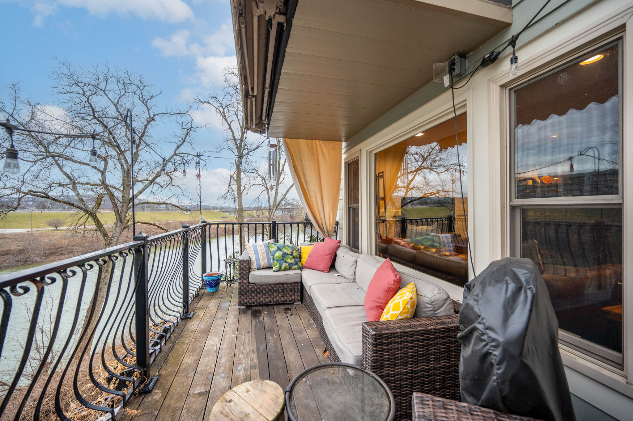 Poised along the riverbank in Covington's coveted Historic Licking Riverside District, this exceptional three-story townhouse offers some of the most breathtaking views in the tristate! From the moment you enter the foyer, a soaring ceiling sets the tone for a home that is equal parts dramatic and refined. The flexible office space stands out with exposed brick and a classic tin ceiling, while the updated kitchen features modern stainless steel appliances and a charming breakfast nook that walks out to one of three expansive decks, each level offering direct outdoor access and unforgettable views. Additional deck underside- roofing updates ensure year-round and all-weather enjoyment. The converted fireplace burns both wood and gas and is accented by a custom mantle, creating a cozy yet stylish focal point. Upstairs, spacious third-floor bedrooms include a stunning primary suite with river and city views, a bay window, modern tiled ensuite bath, and dual shower heads. With three tiers of decking, incredible natural light, and a truly irreplaceable location, this home is a rare opportunity to own a front-row seat to one of the most iconic views in the region.