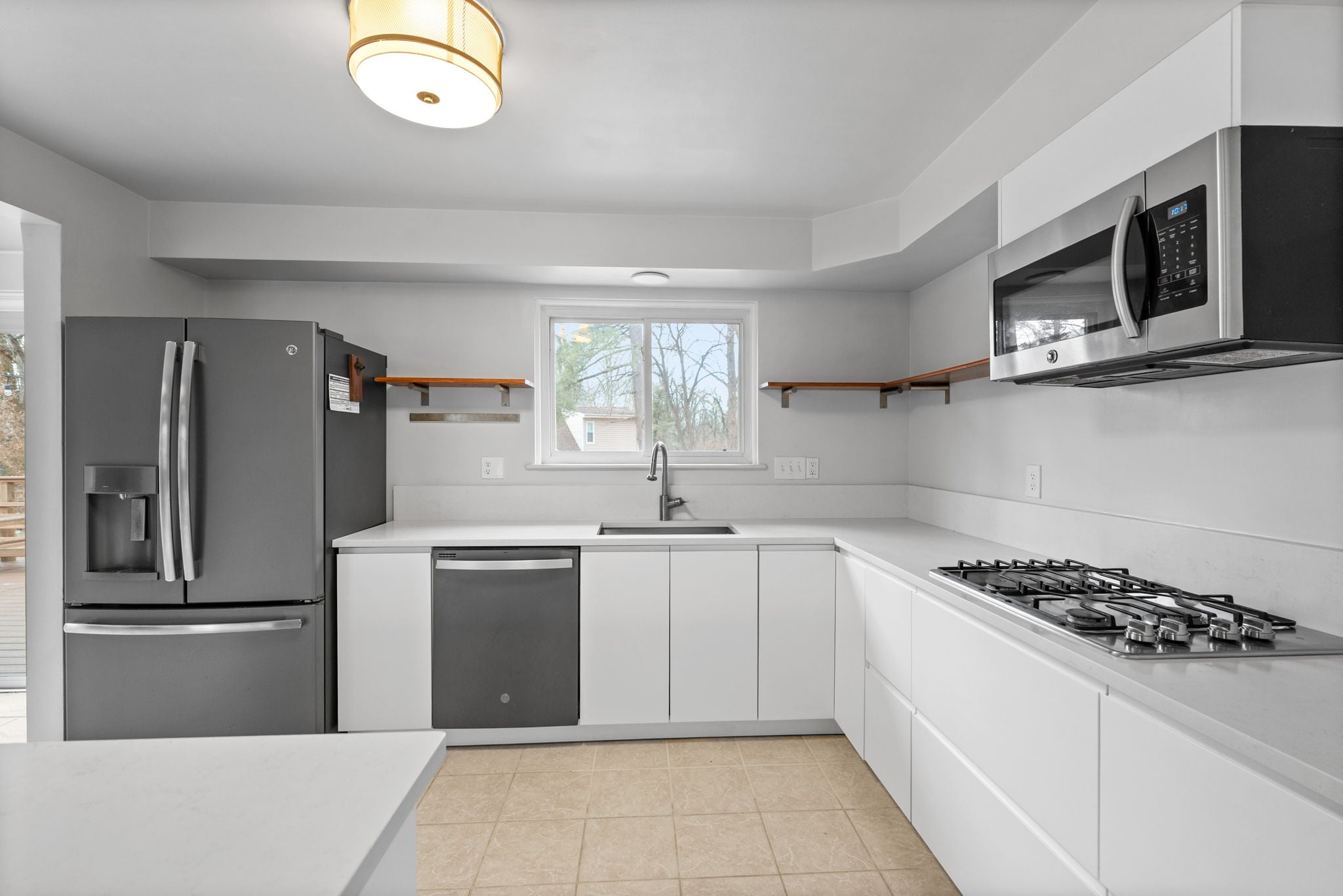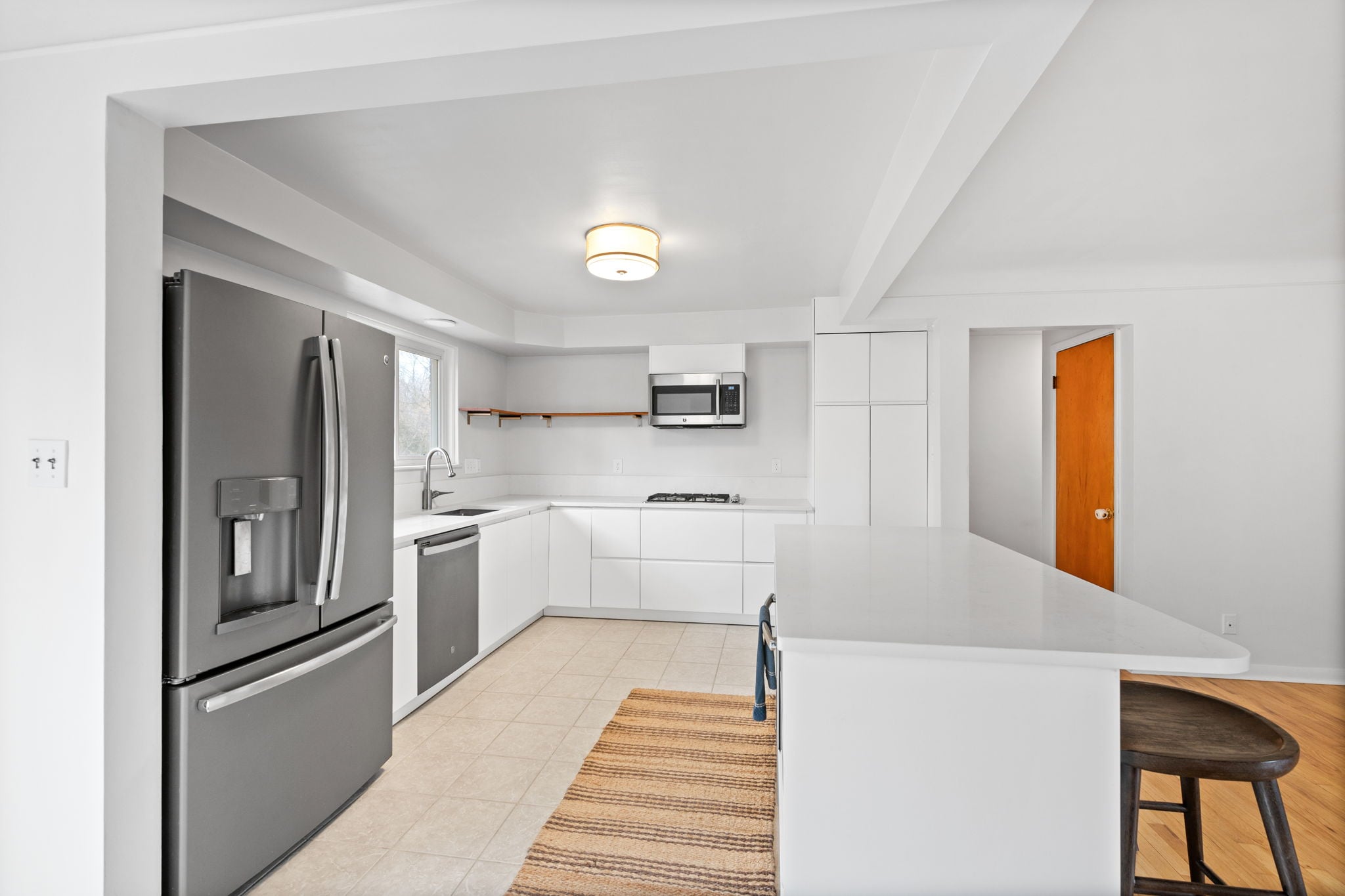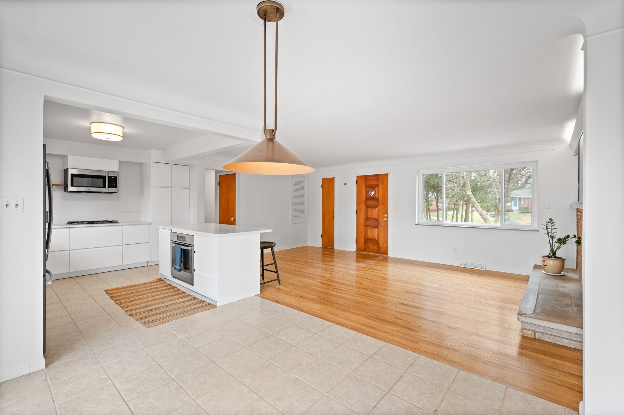 The living space is centered around a classic brick fireplace, brand new front window and newly refinished hardwood flooring. The remodeled kitchen includes stainless steel appliances, counter seating and a dining area. Bonus: A partially finished lower level adds valuable extra living space.