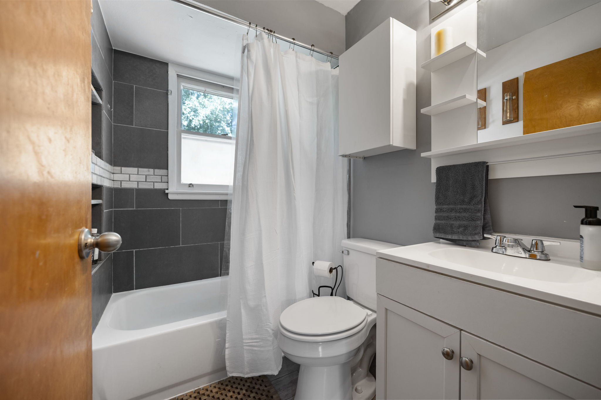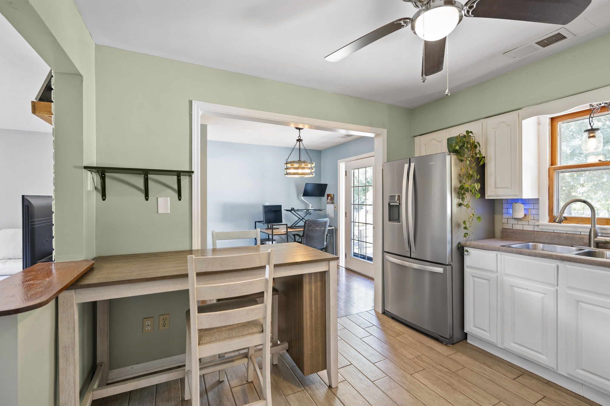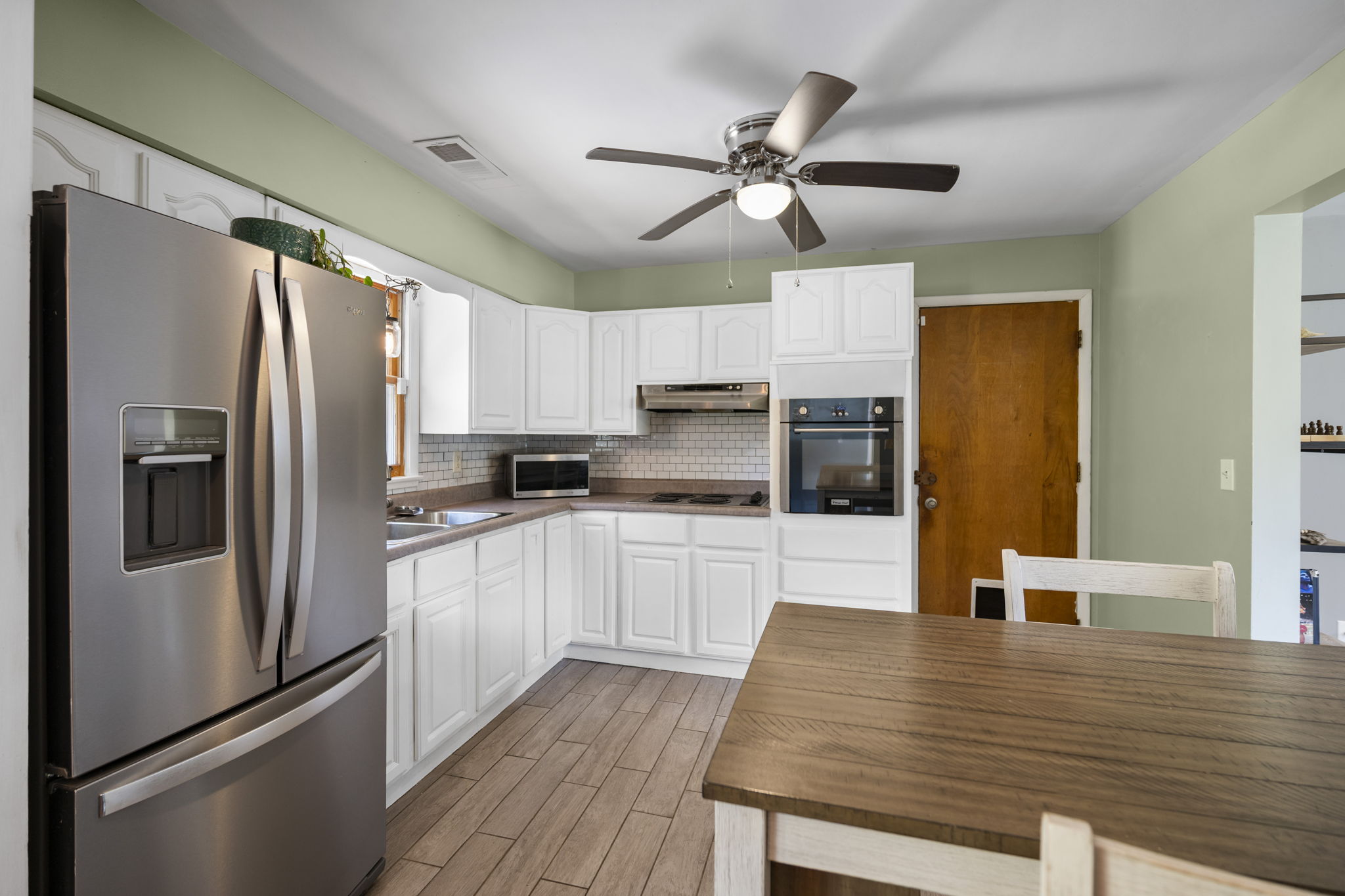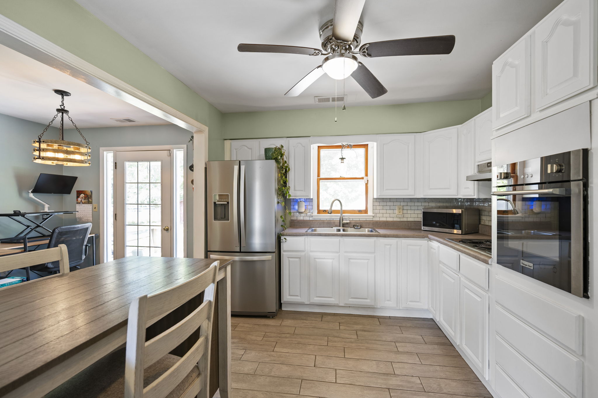 The updated kitchen offers modern stainless steel appliances and overlooks a spacious backyard perfect for entertaining or simply relaxing outdoors.