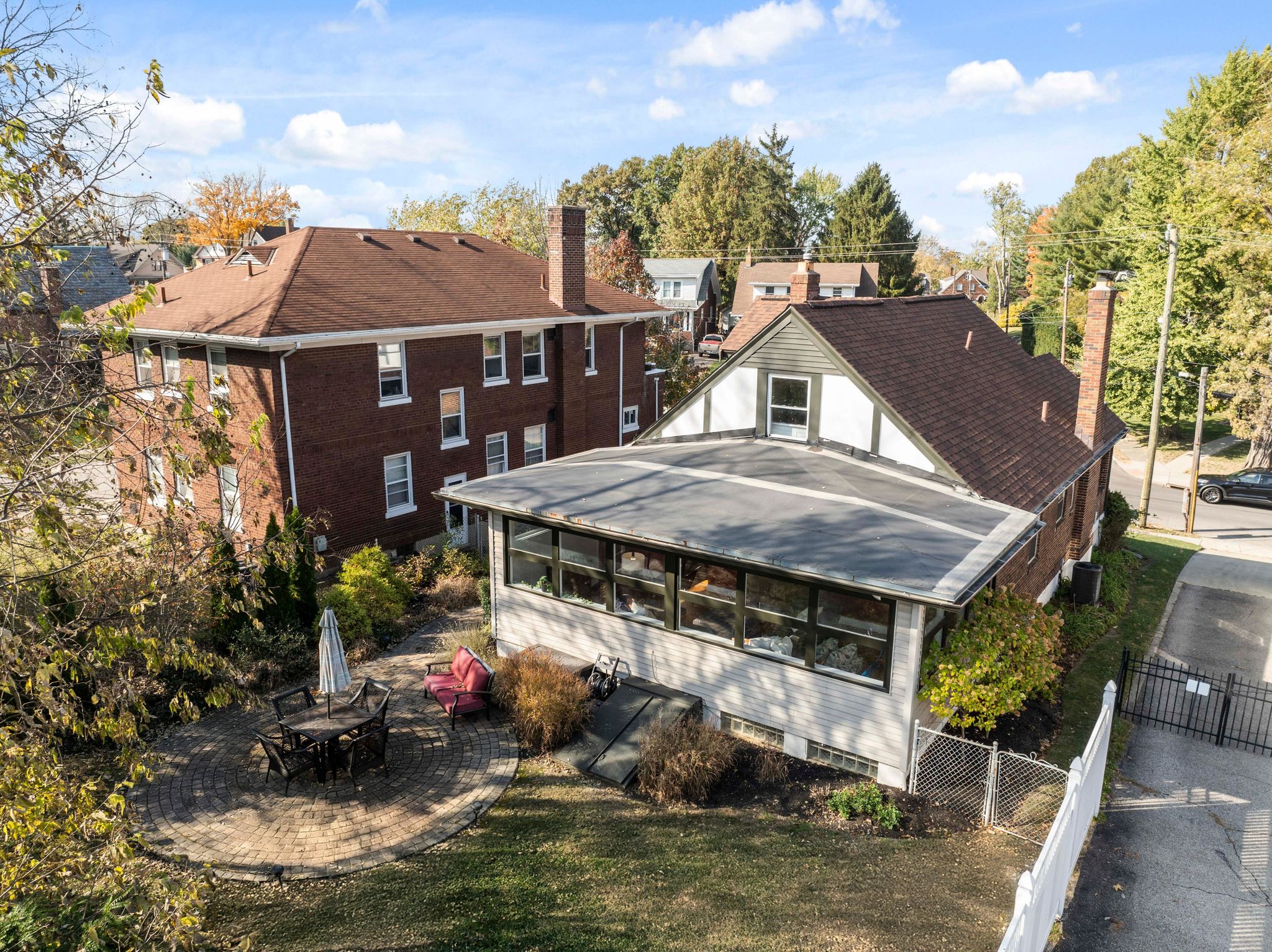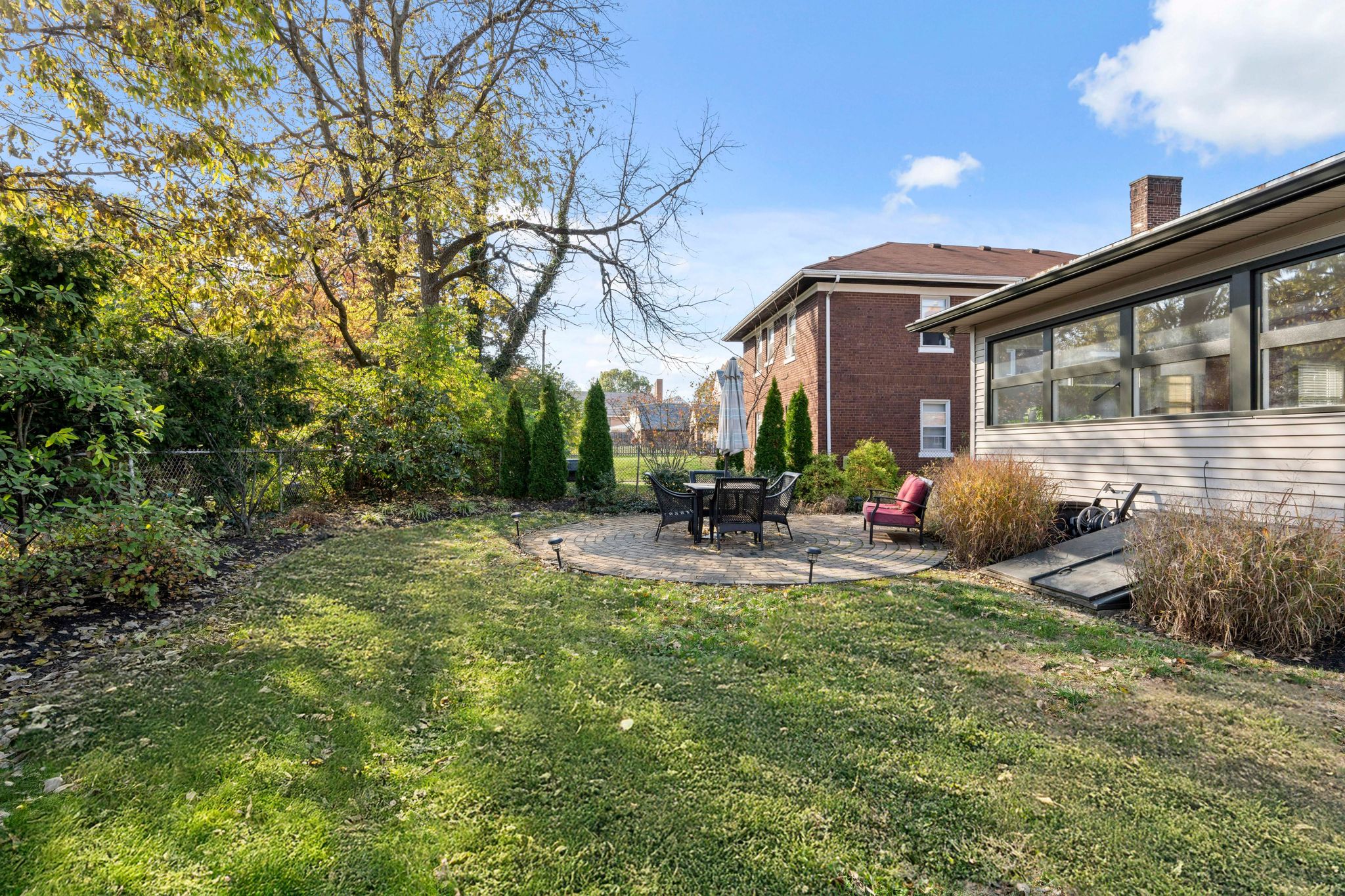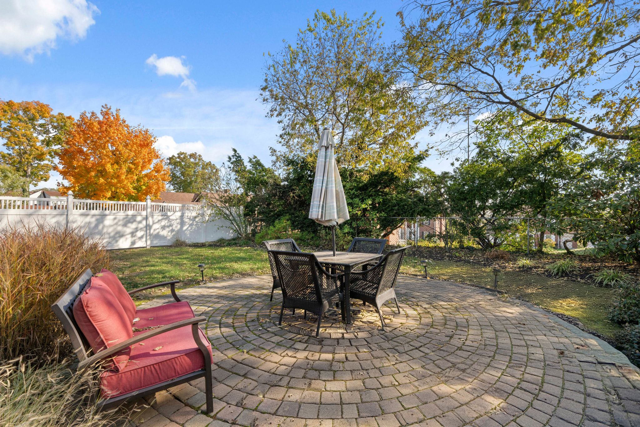 The expansive first-floor family room showcases character-rich parquet flooring and stunning views of the fenced backyard, complete with a new paver patio.