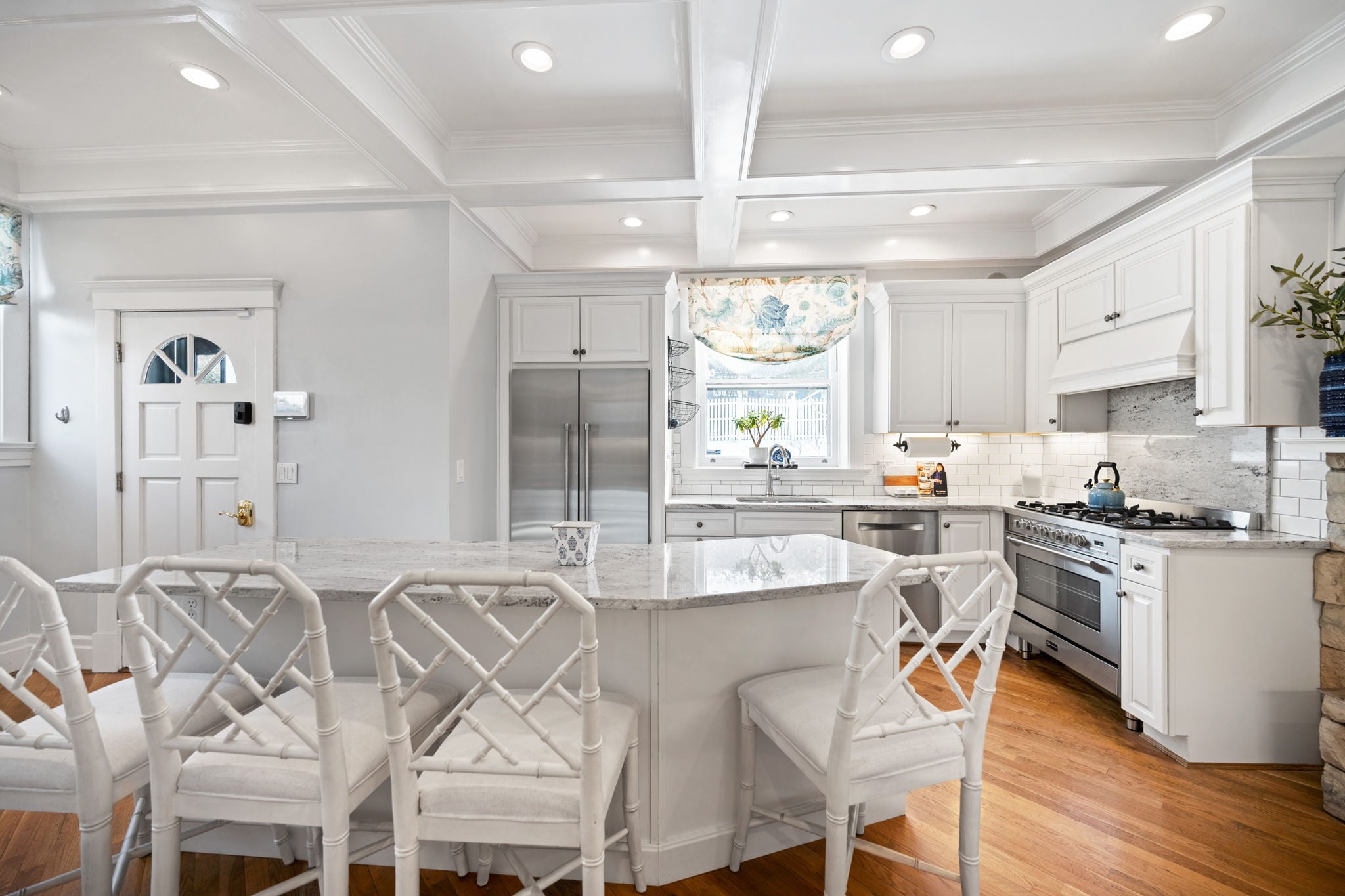 Formal living and dining rooms exude timeless sophistication, while the impressive kitchen features luxury appliances and opens to a warm, inviting family room anchored by a grand picture window overlooking the fenced backyard.