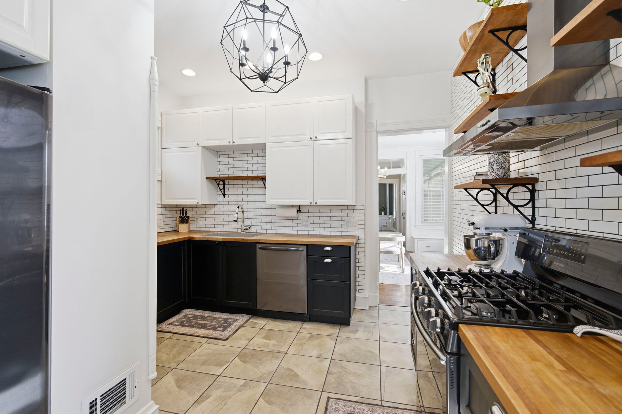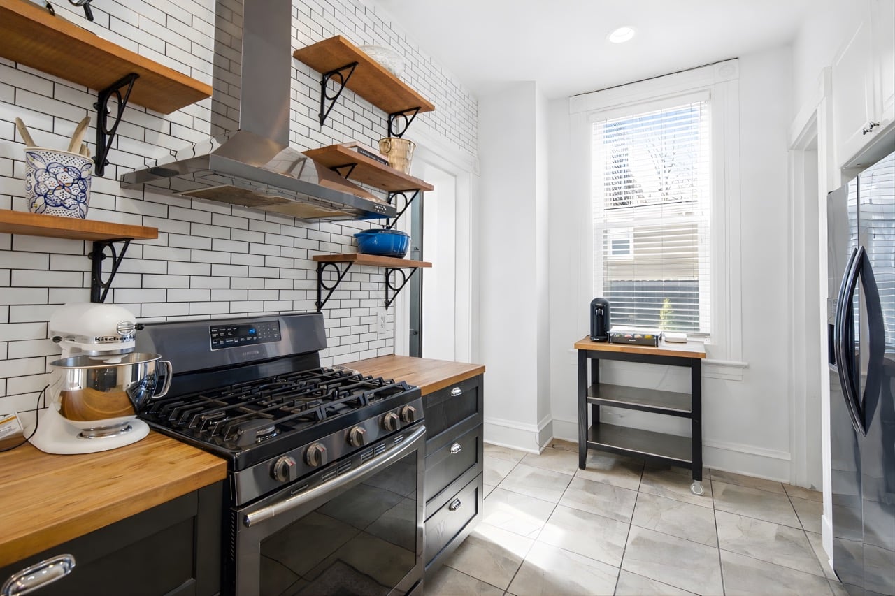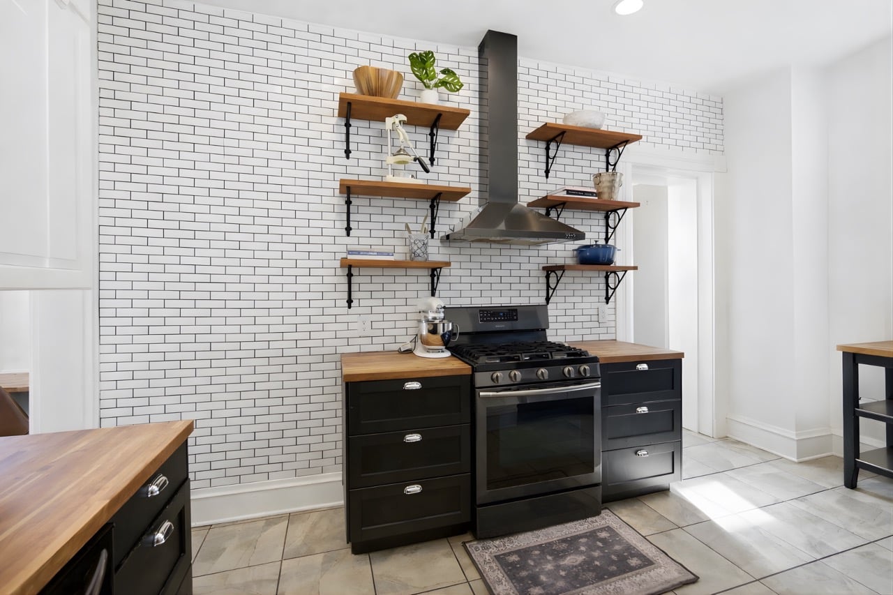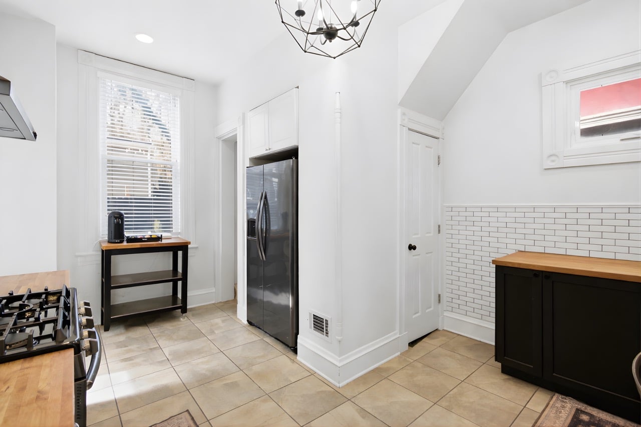 The beautifully updated kitchen features butcher block counters, modern tile, and a gas range, with walk-out access to the patio. Just off the kitchen, the formal dining room is filled with natural light