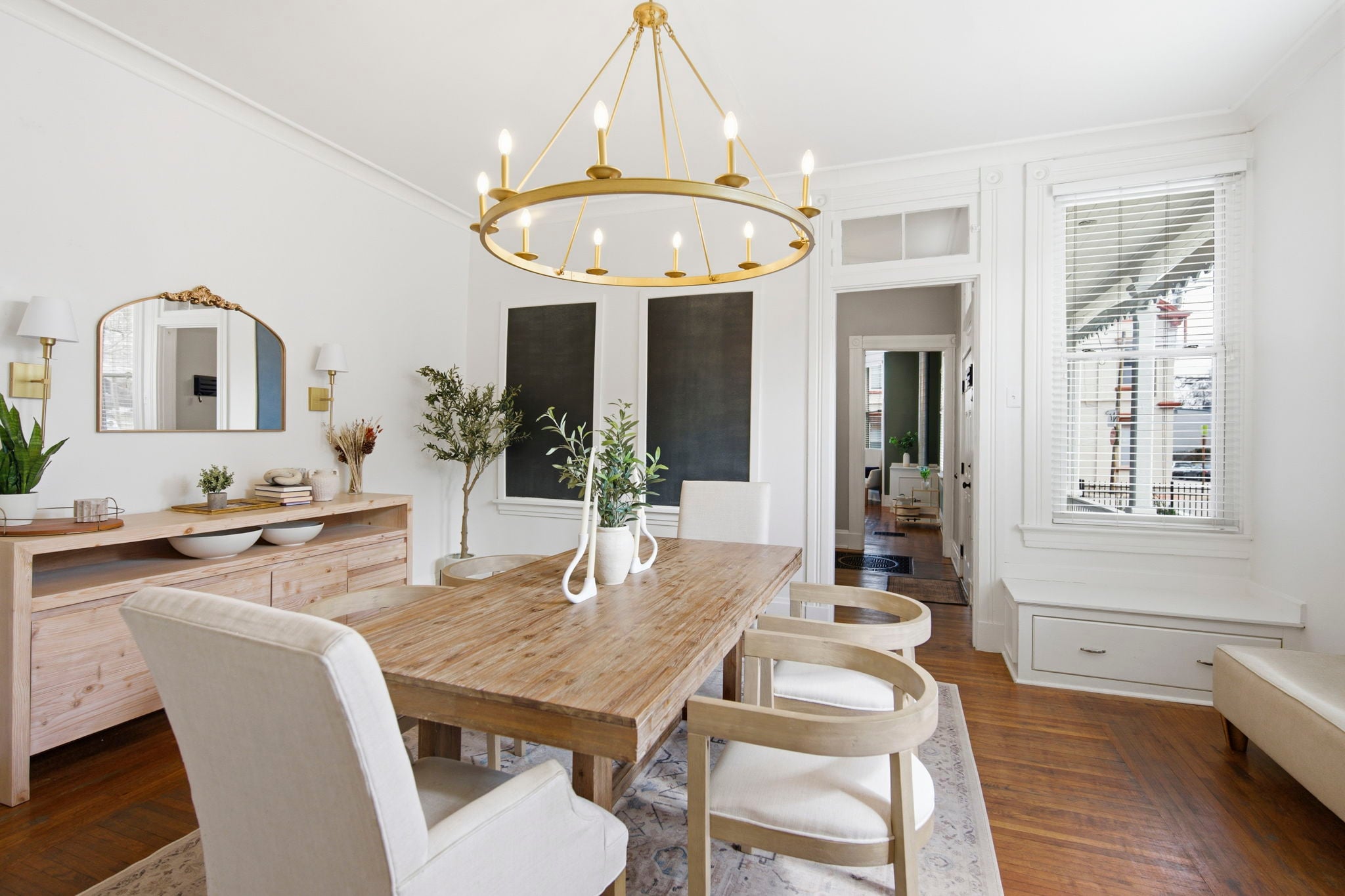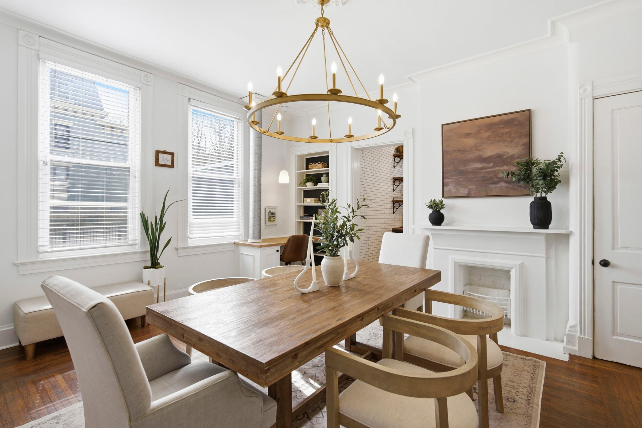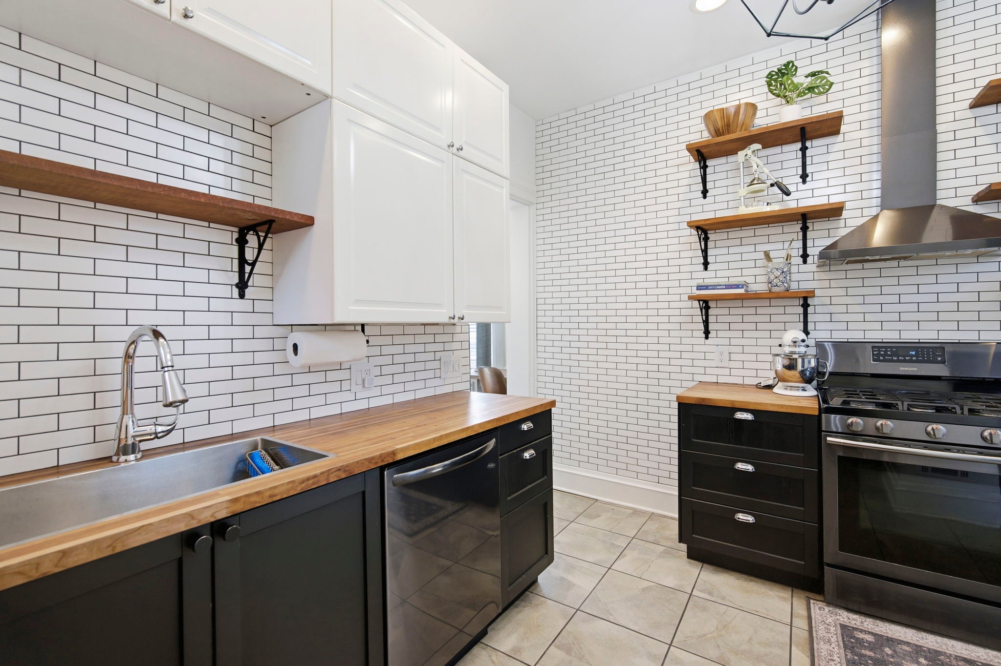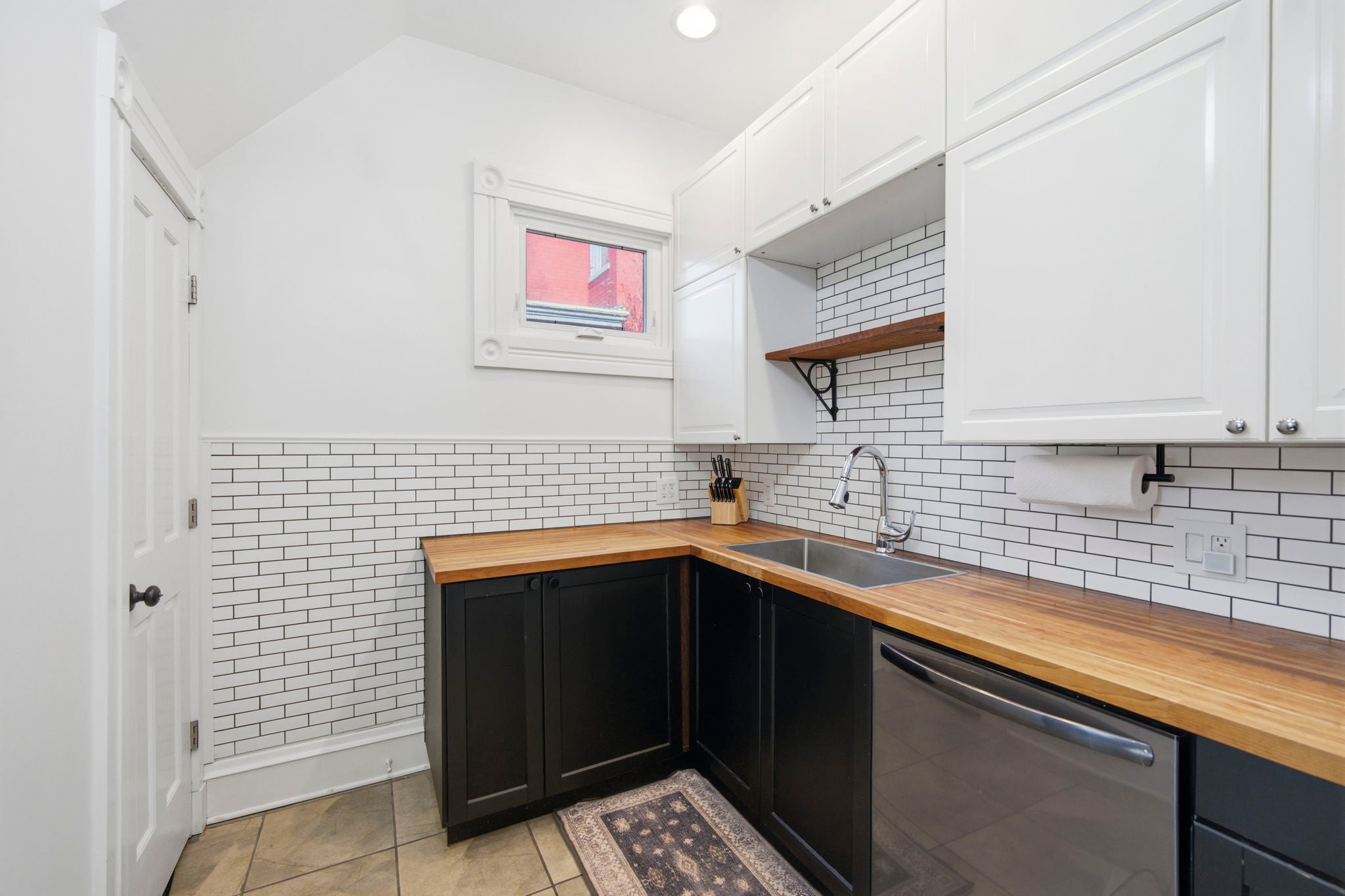 The beautifully updated kitchen features butcher block counters, modern tile, and a gas range, with walk-out access to the patio. Just off the kitchen, the formal dining room is filled with natural light