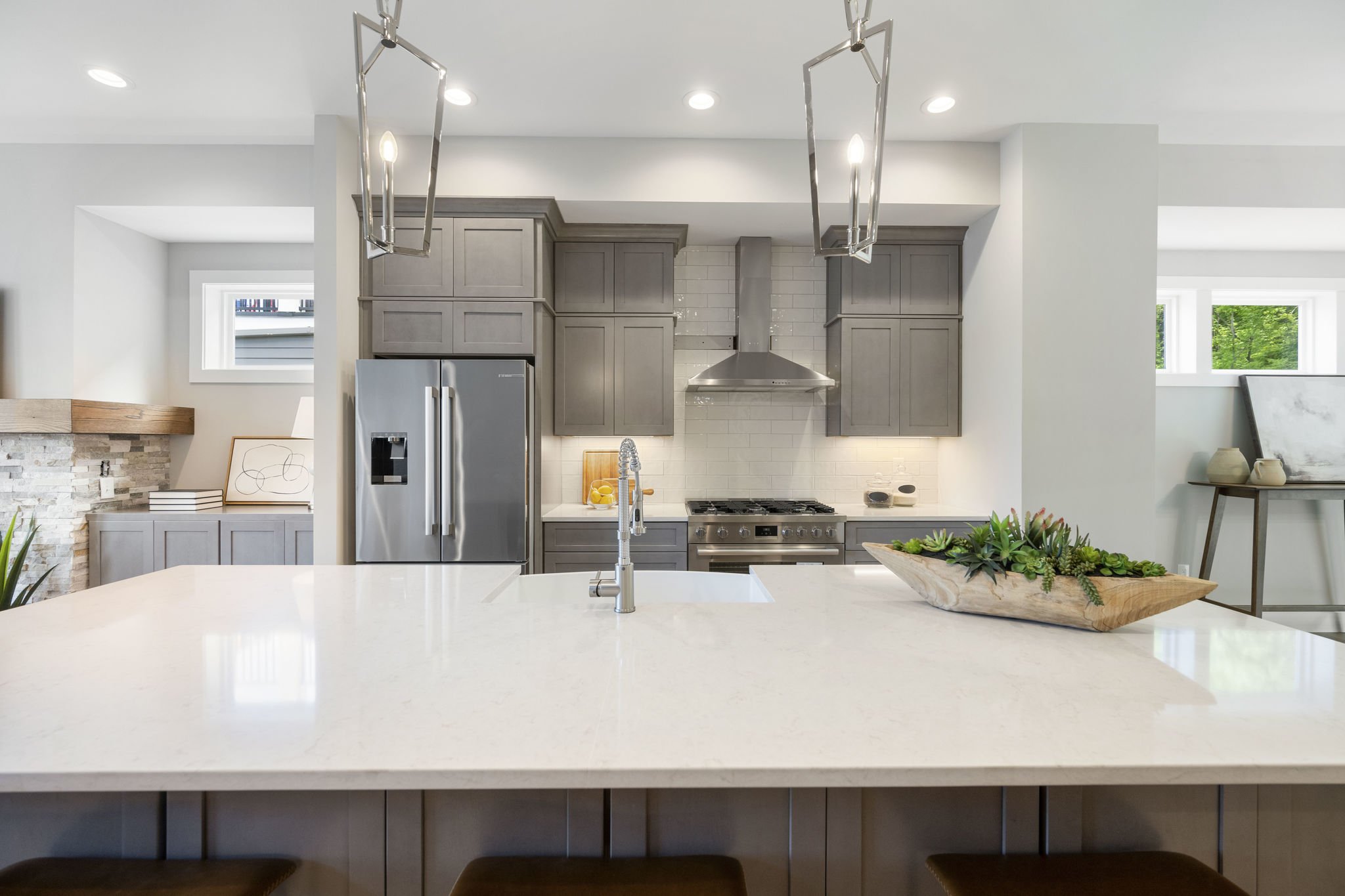 Built-ins around the gas fireplace + crown moulding details. 42-inch kitchen cabinets, farmer sink, gas cooktop and granite countertops.
