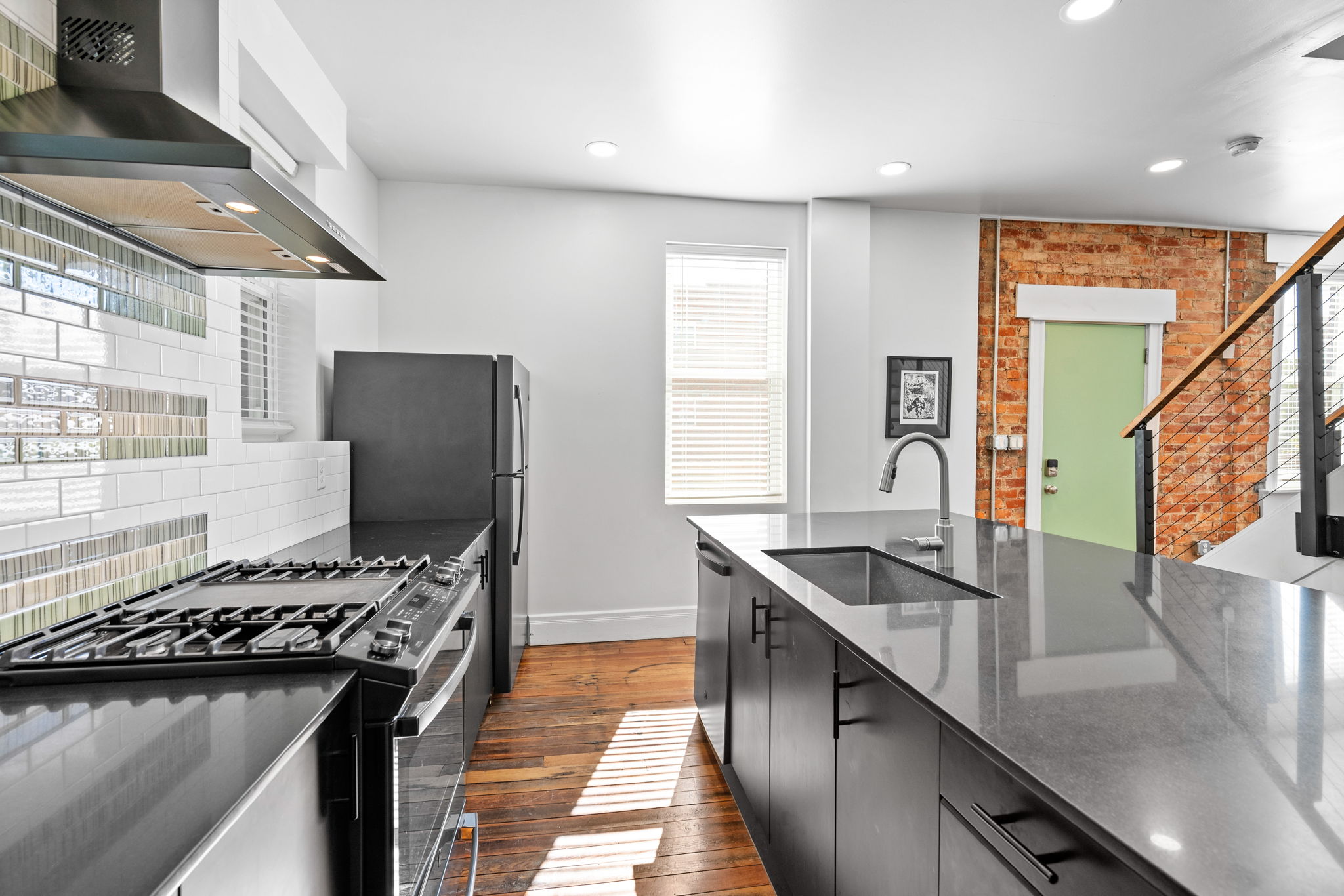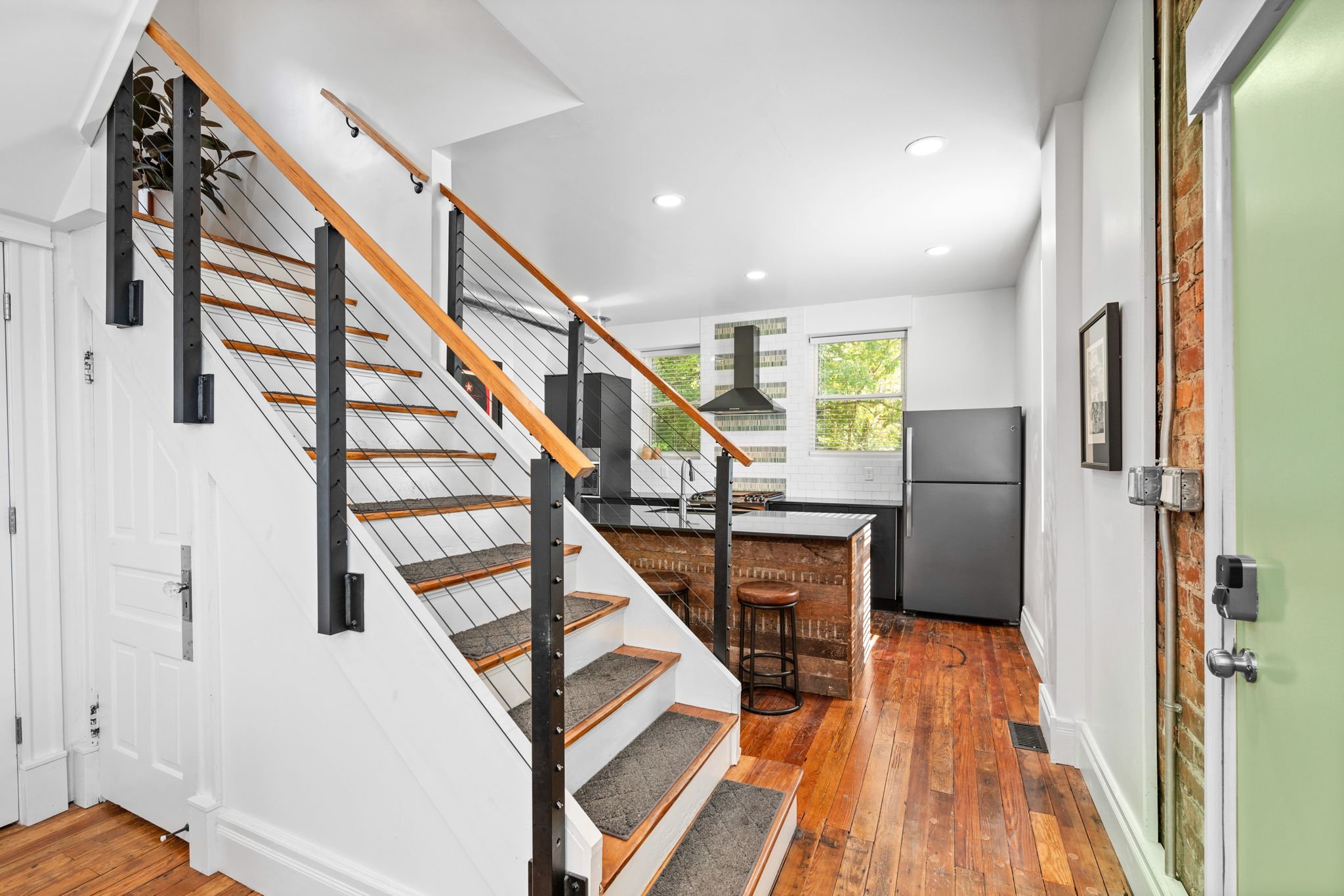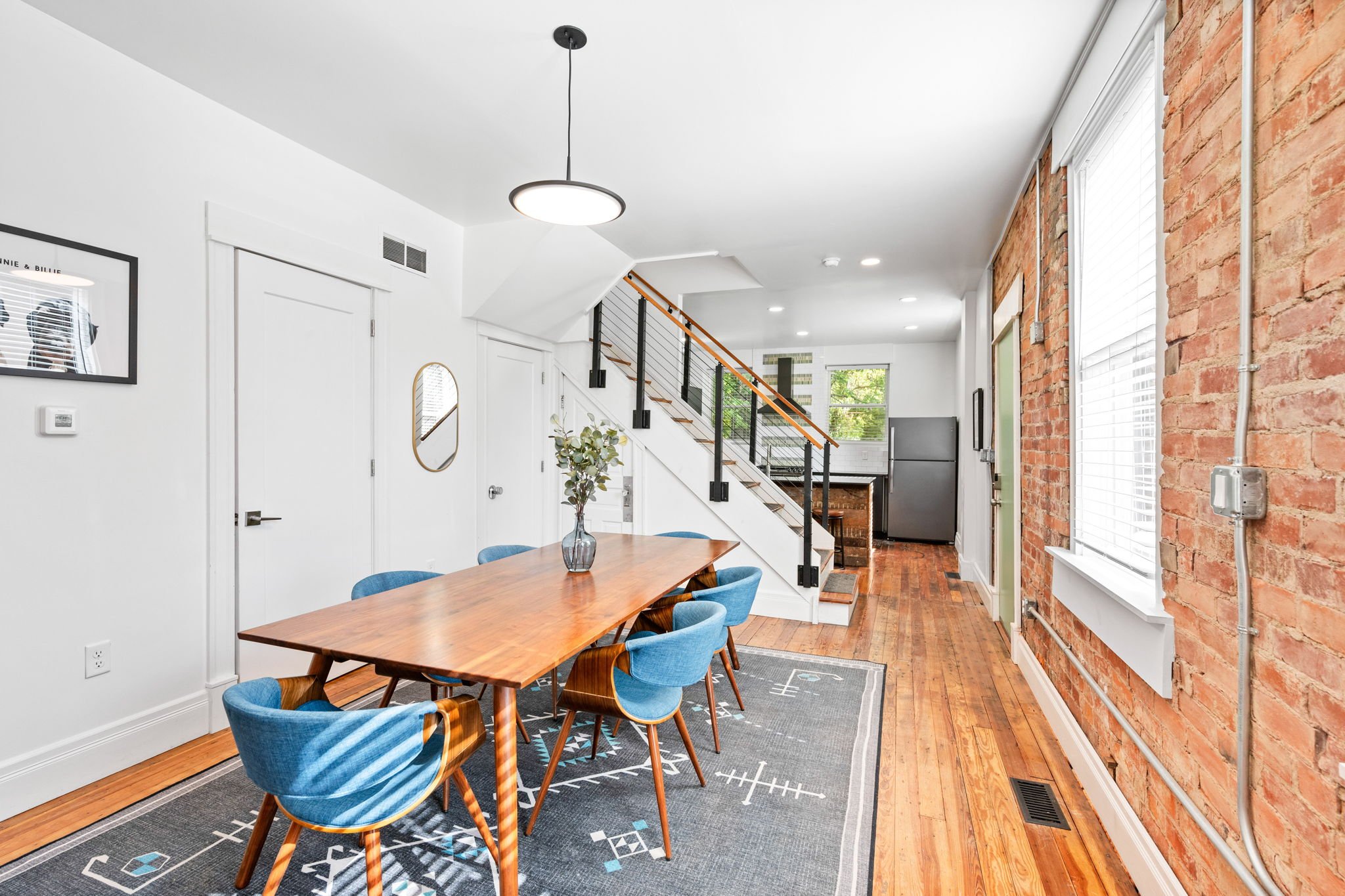 The first floor features a fully remodeled kitchen with an island and counter bar, a bright and spacious dining/living area, and a convenient half bath.
