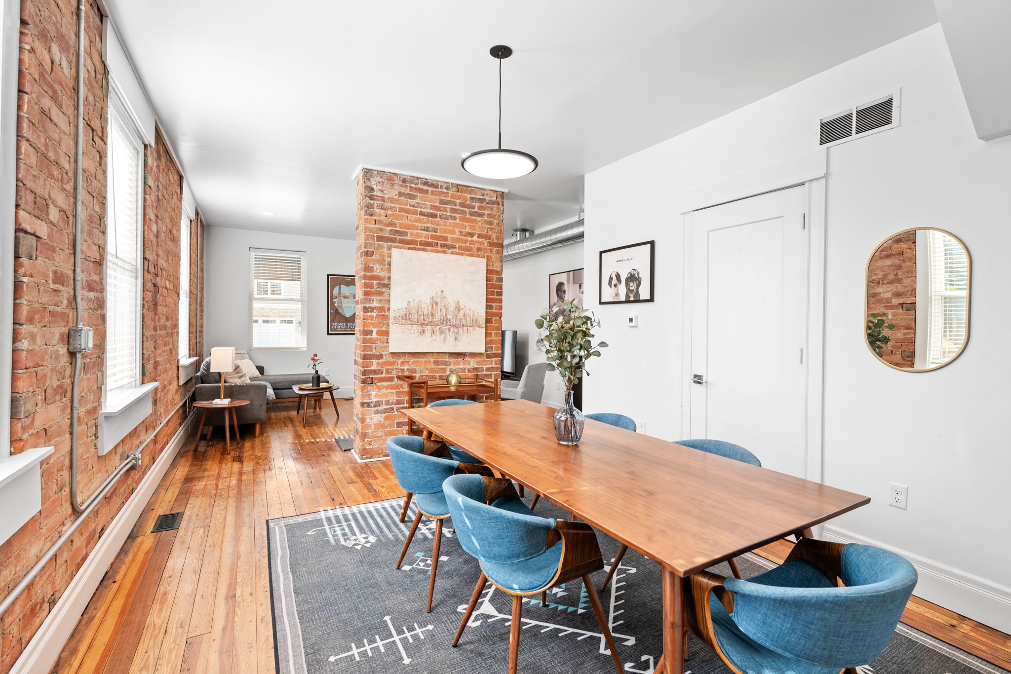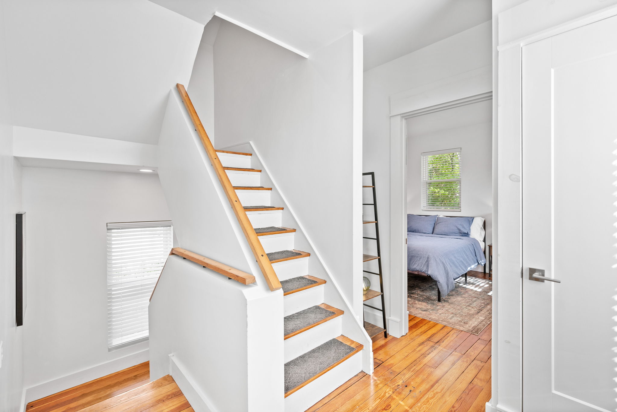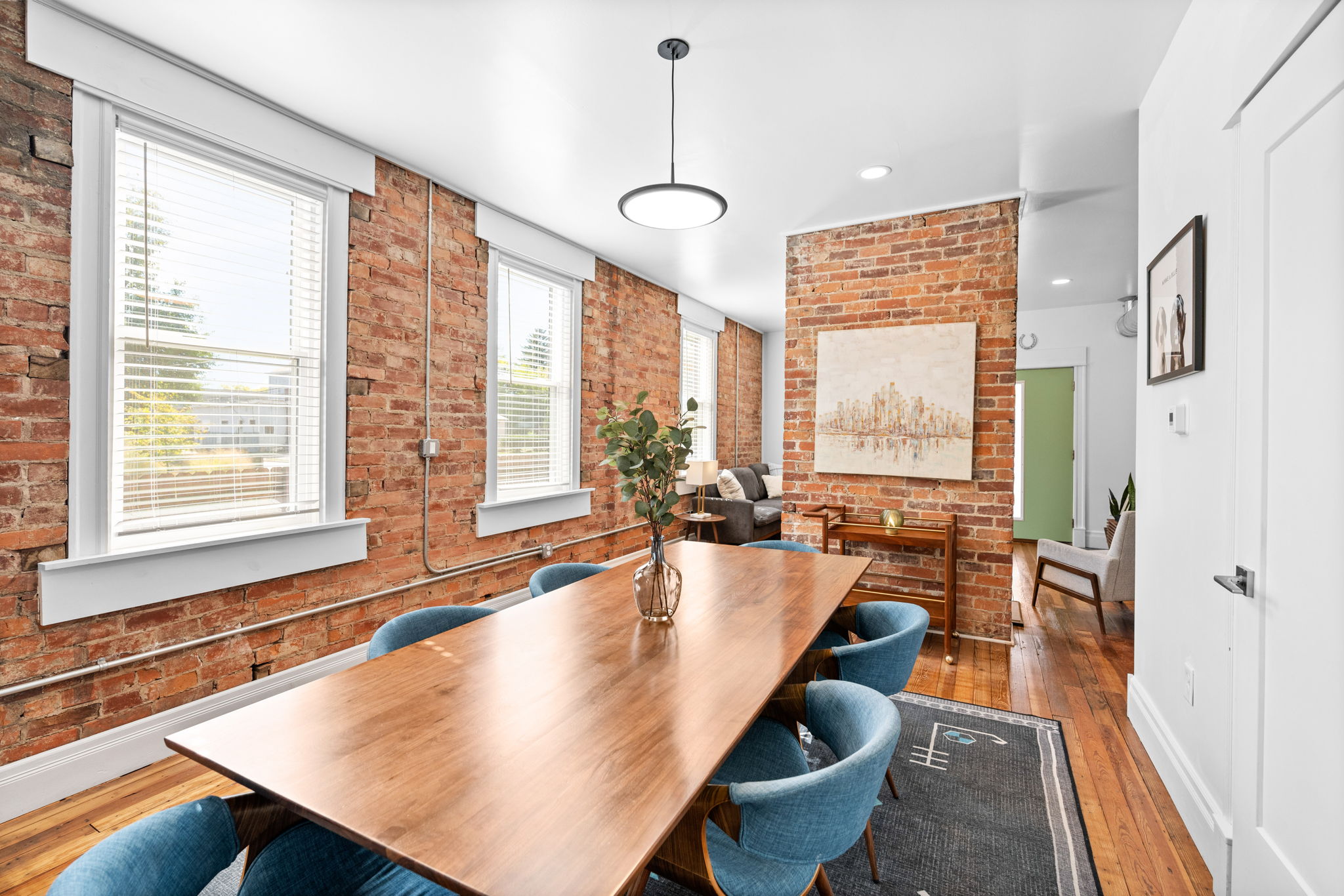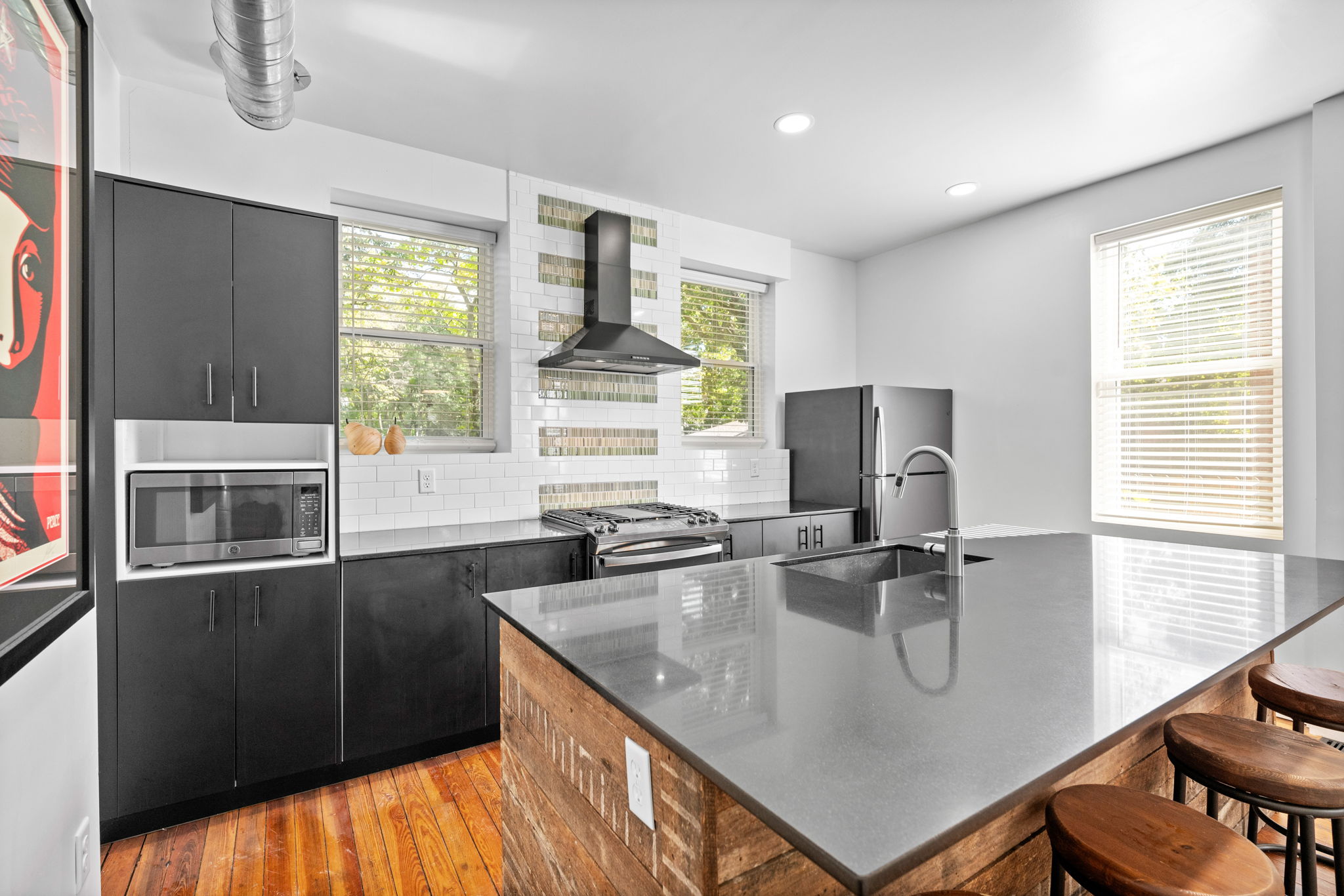 The first floor features a fully remodeled kitchen with an island and counter bar, a bright and spacious dining/living area, and a convenient half bath.