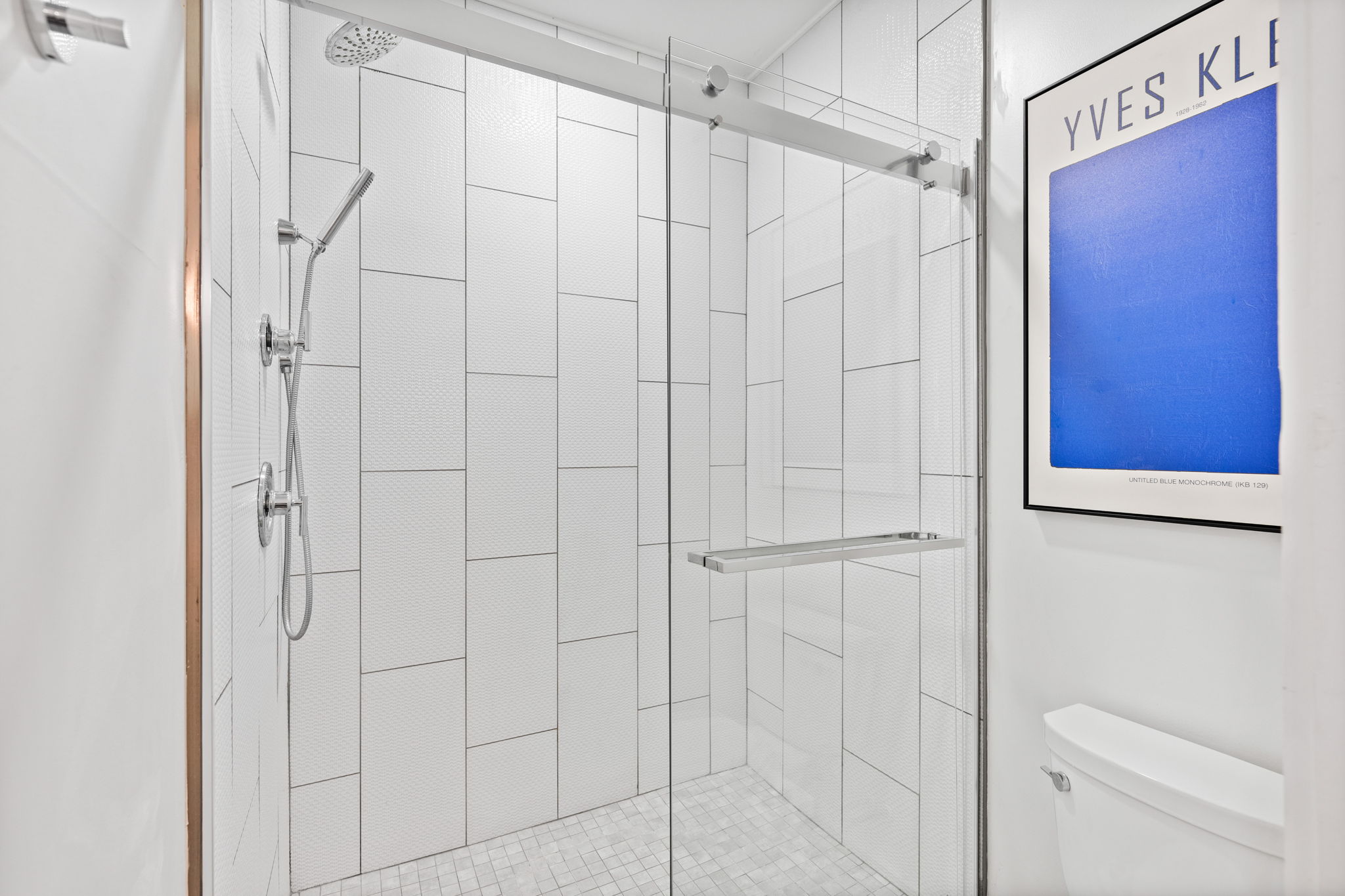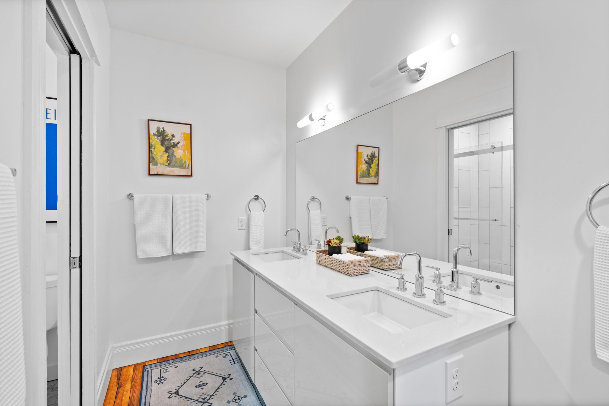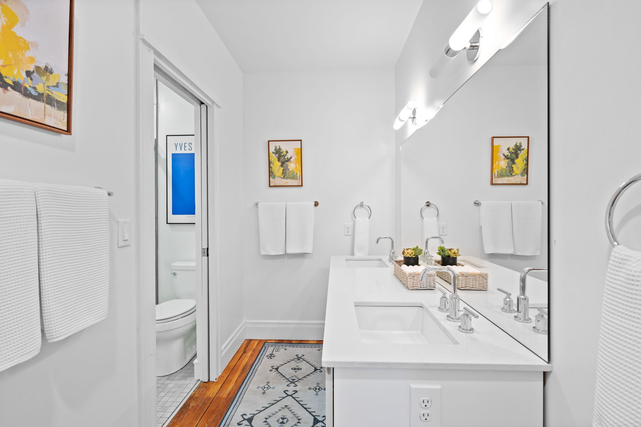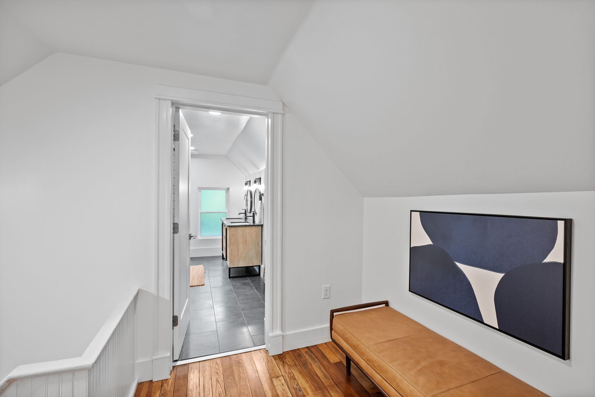The second floor boasts a stunning primary suite with a spa-like bathroom featuring quartz countertops and porcelain tile, plus a massive walk-in closet with a custom Elfa system. The third floor offers a versatile bedroom/office combination and another spacious full bath.