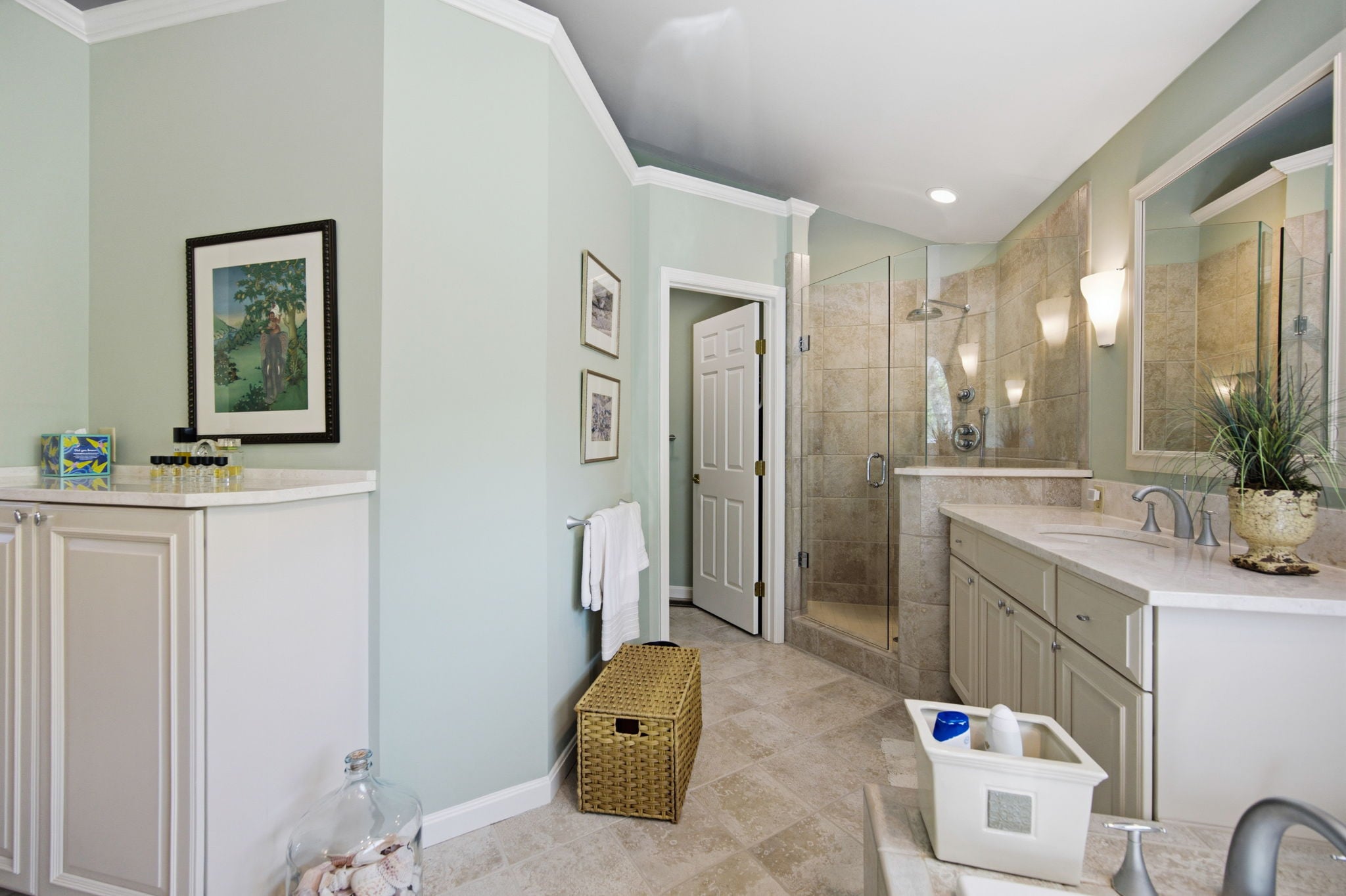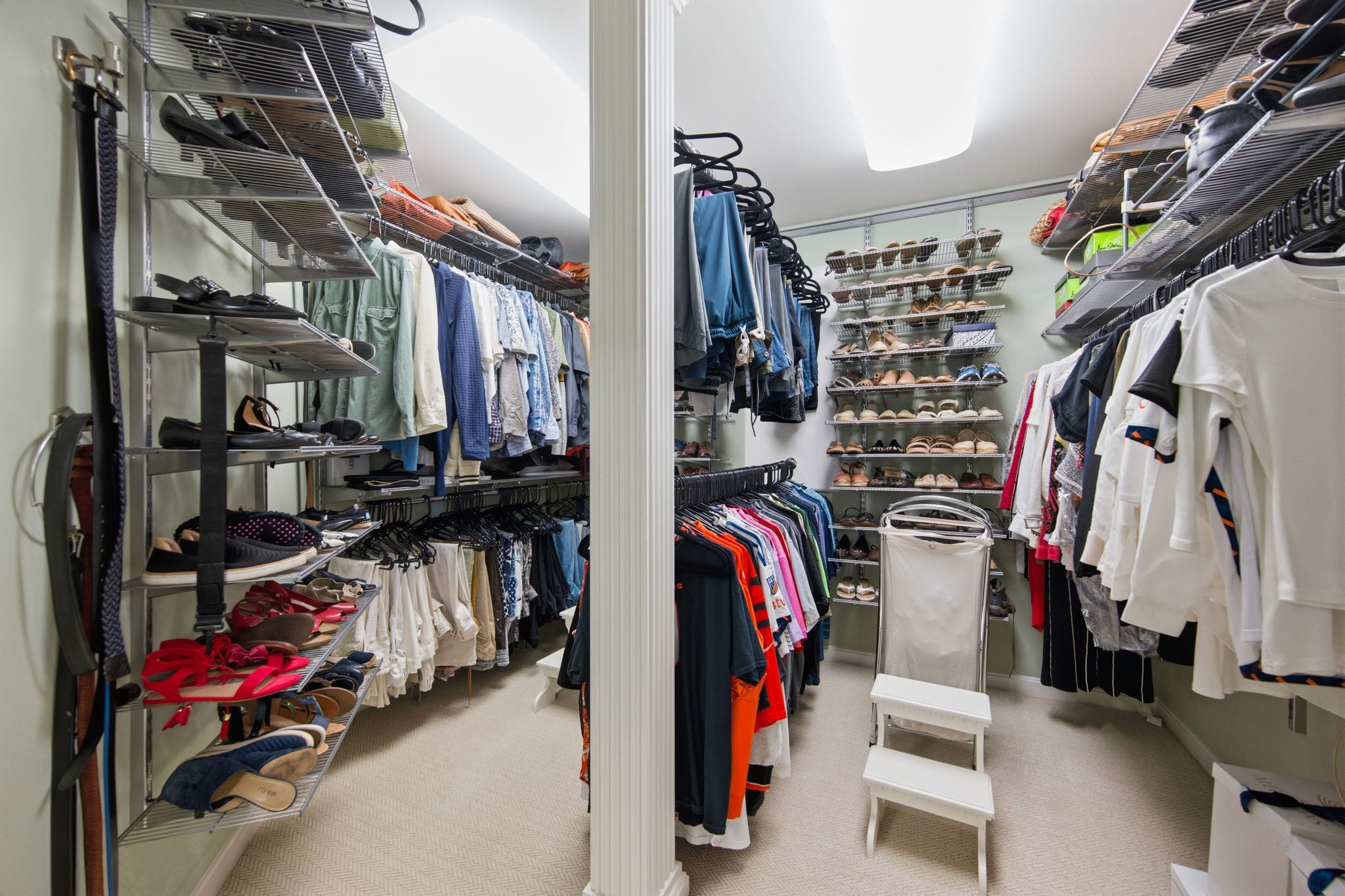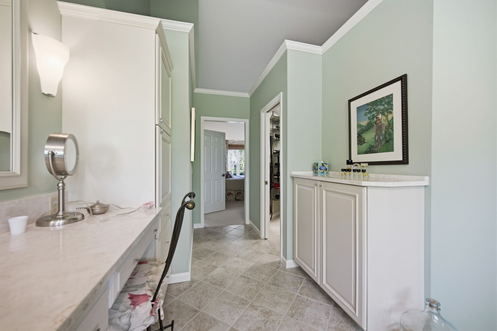 The primary suite with a large custom closet & ensuite bath with tile & glass shower, generous storage, and a vanity sitting area.