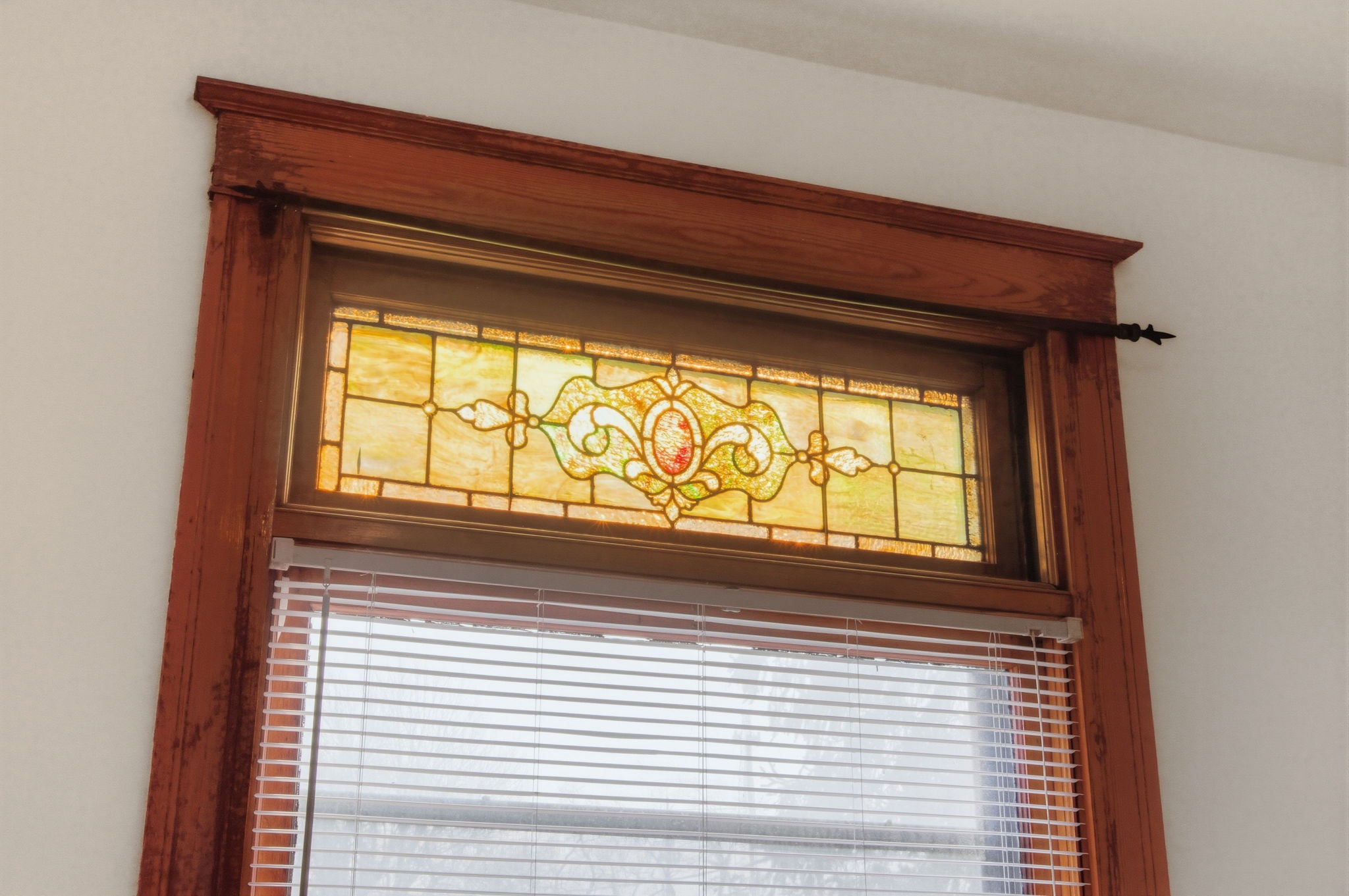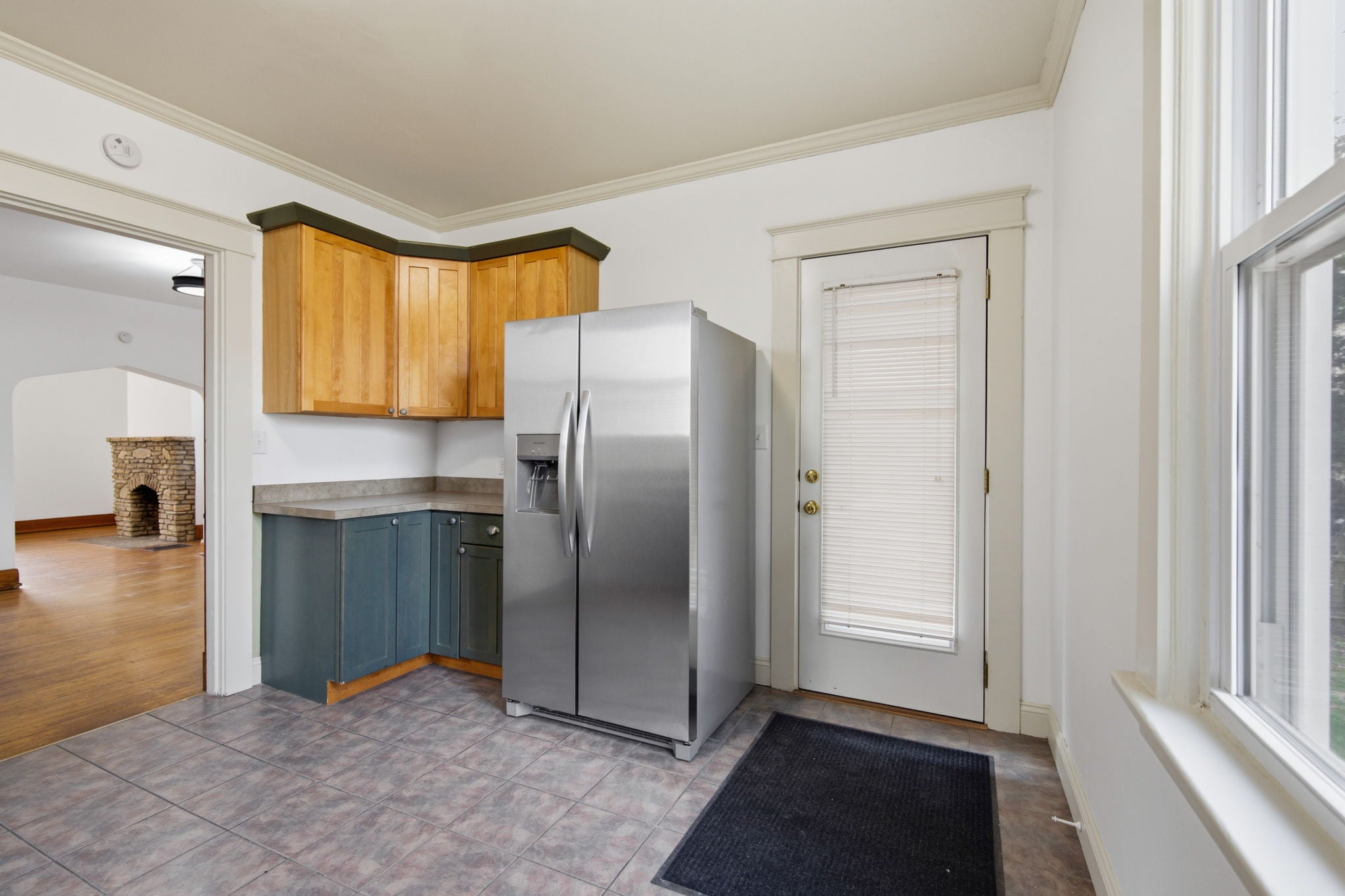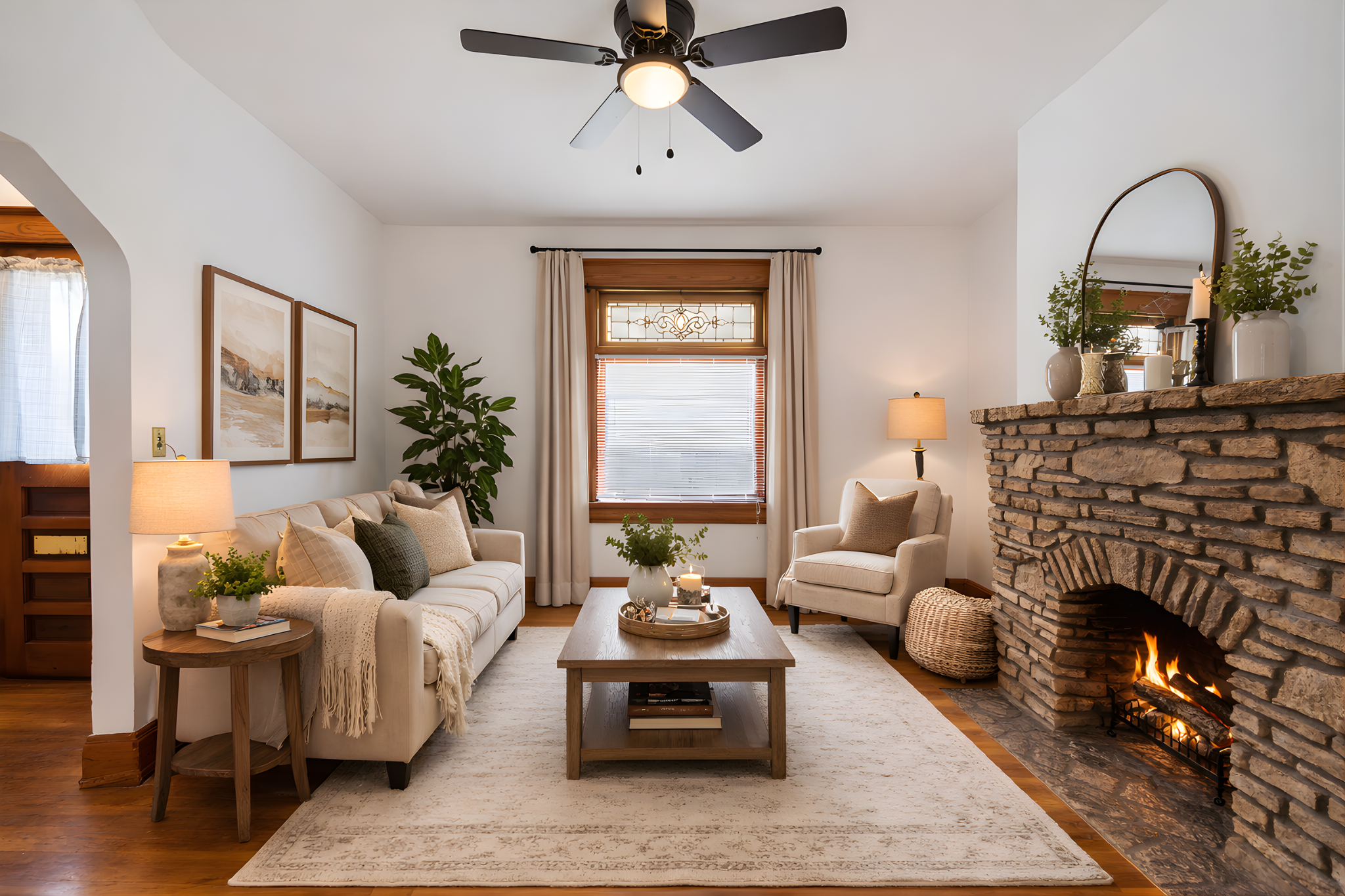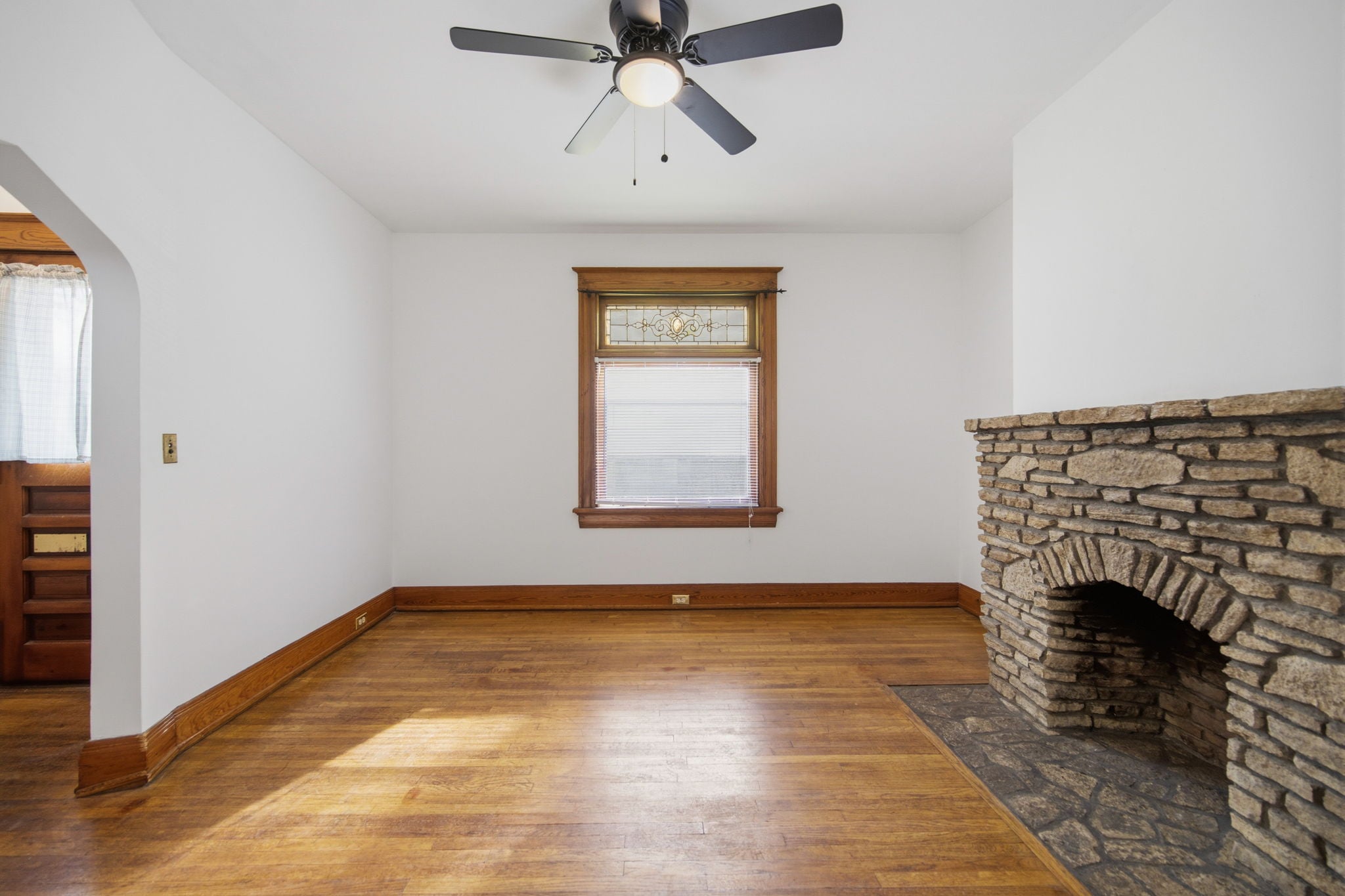 The living room offers a charming decorative stone fireplace and a lovely stained glass window that adds to the home's timeless appeal.
