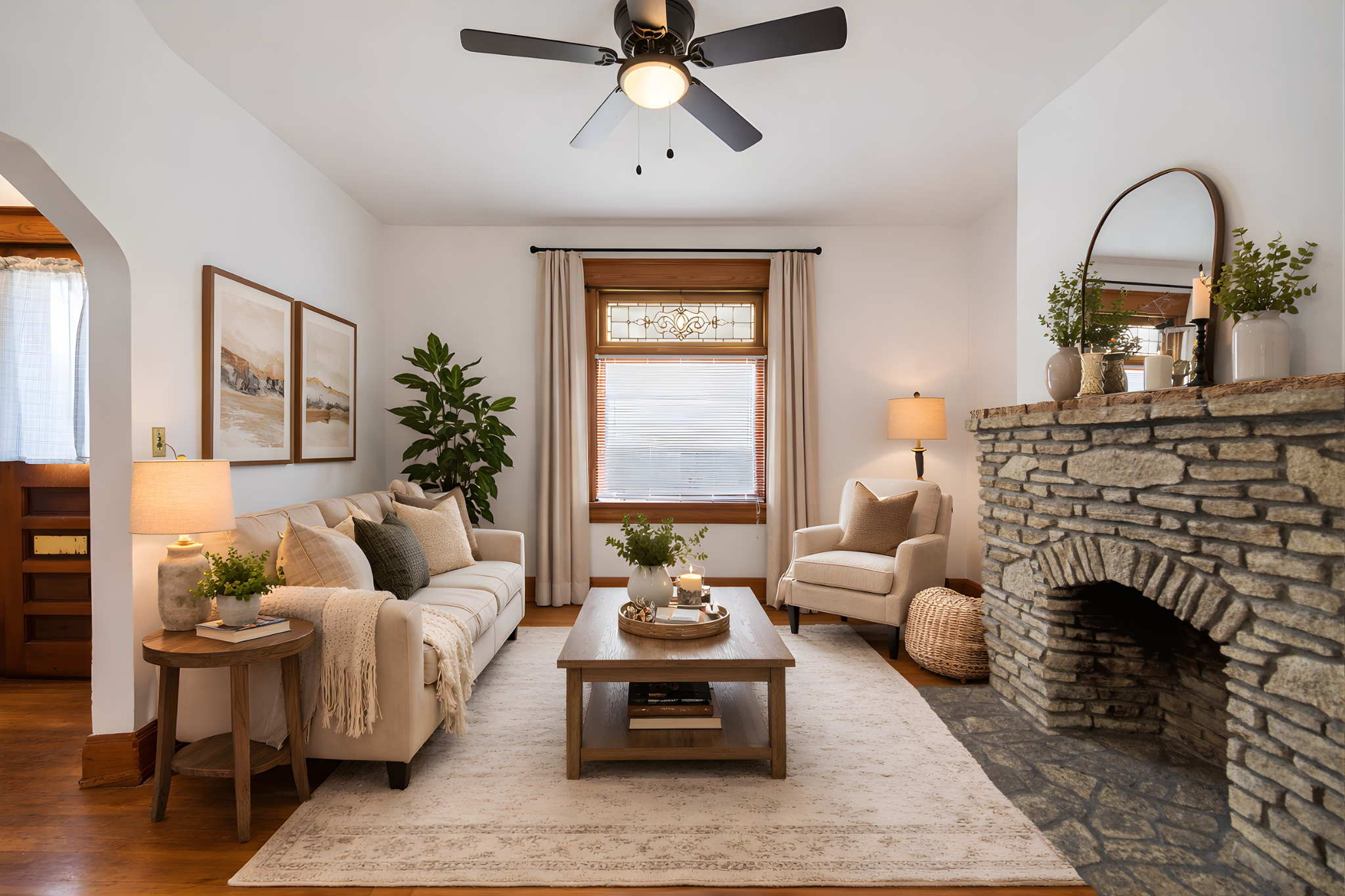 The living room offers a charming decorative stone fireplace and a lovely stained glass window that adds to the home's timeless appeal.