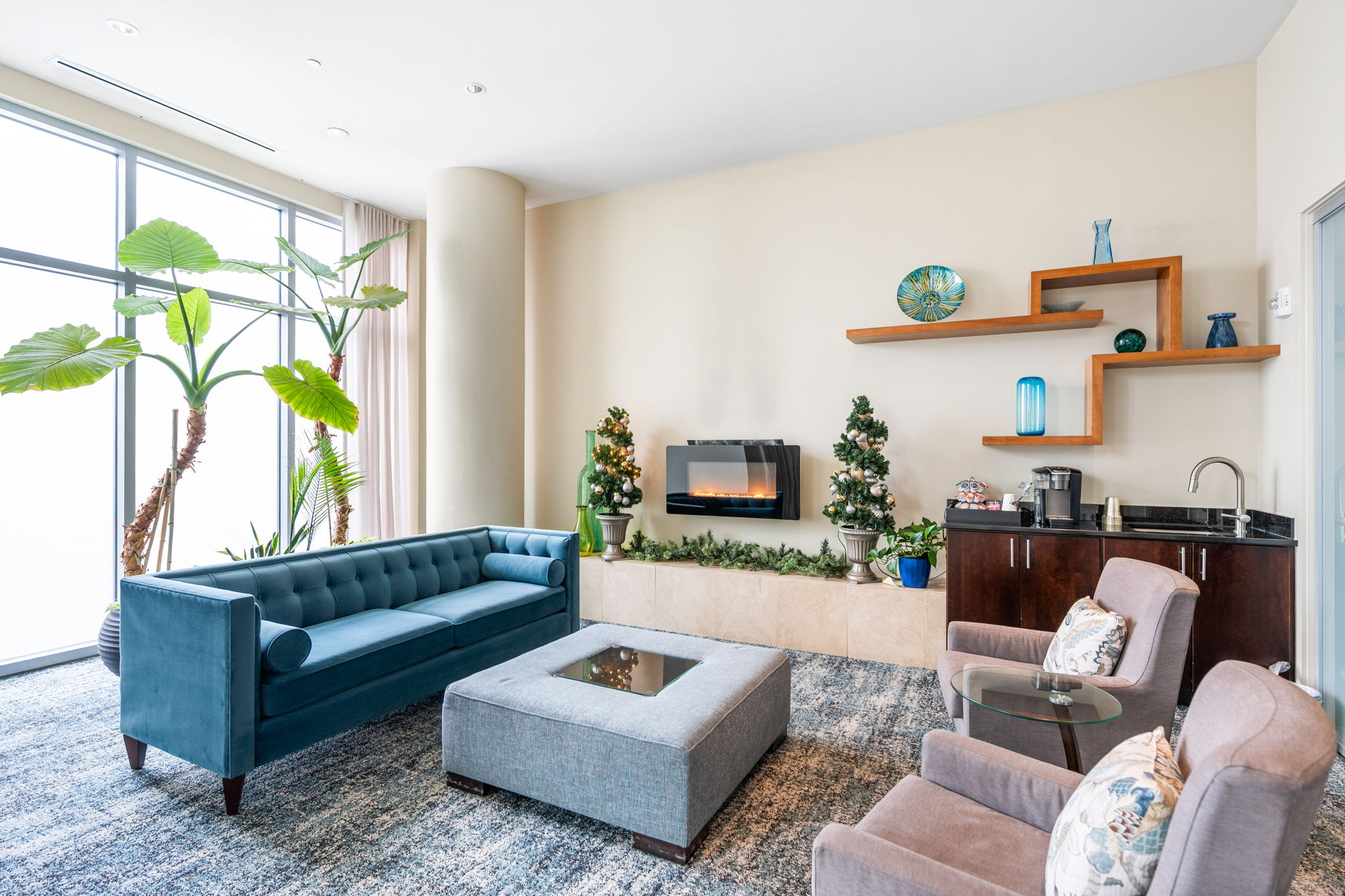 The open concept living area features a dry bar and walks out to a private balcony overlooking the Ohio River and Cincinnati skyline.