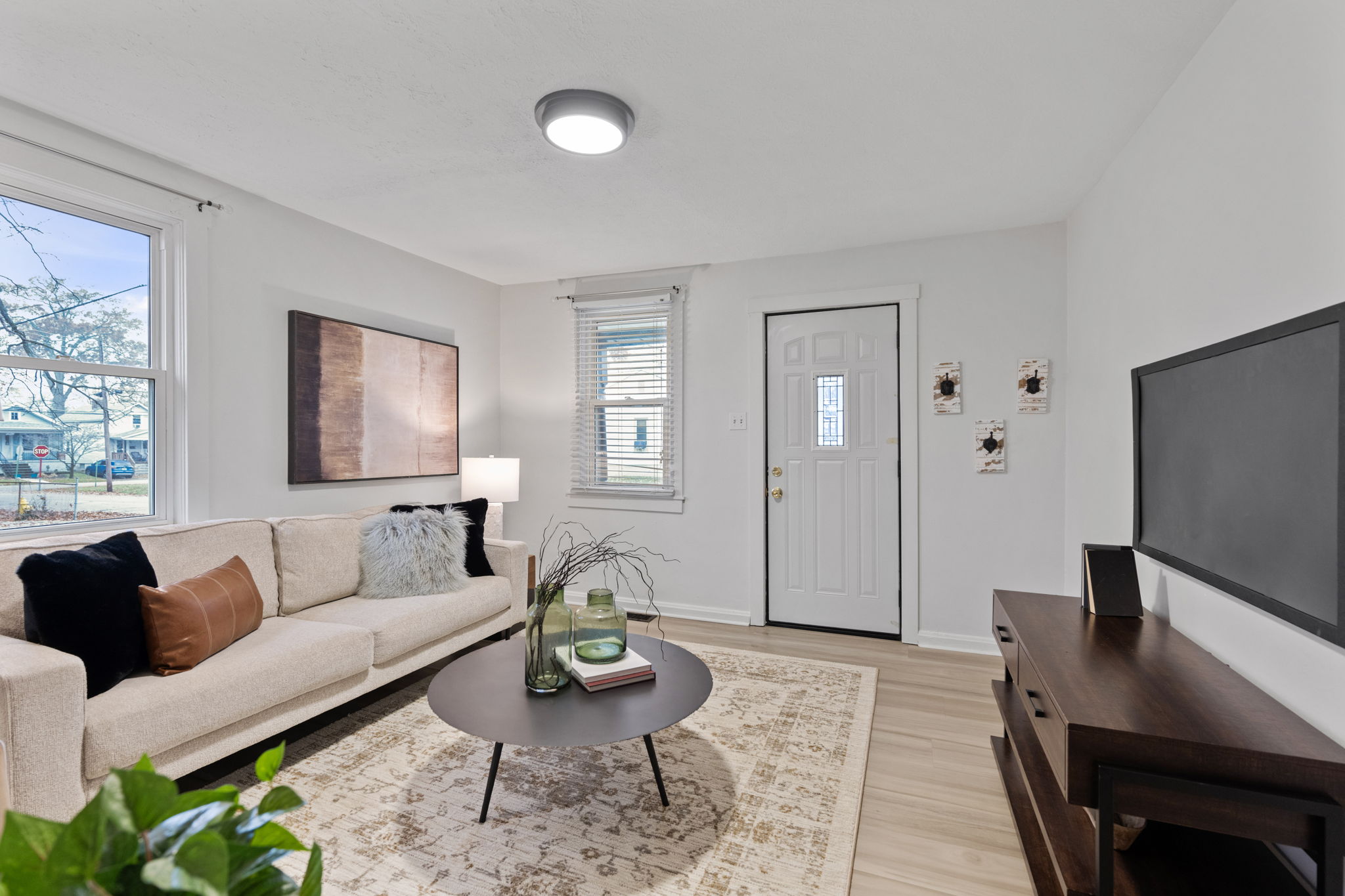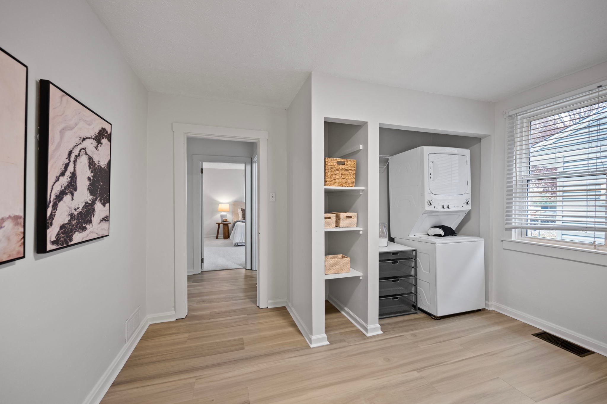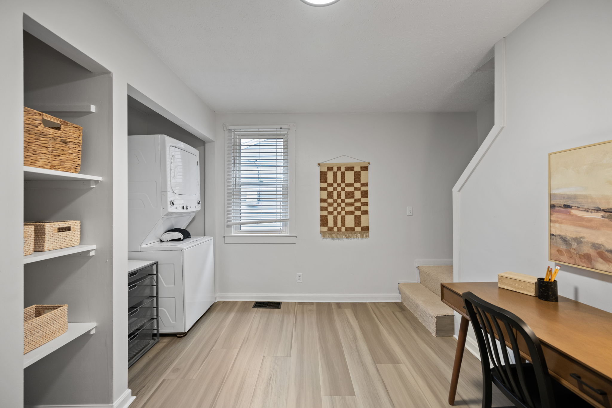 The main level features a cozy living area, a generously sized primary bedroom, and an exceptionally spacious first-floor laundry room.
