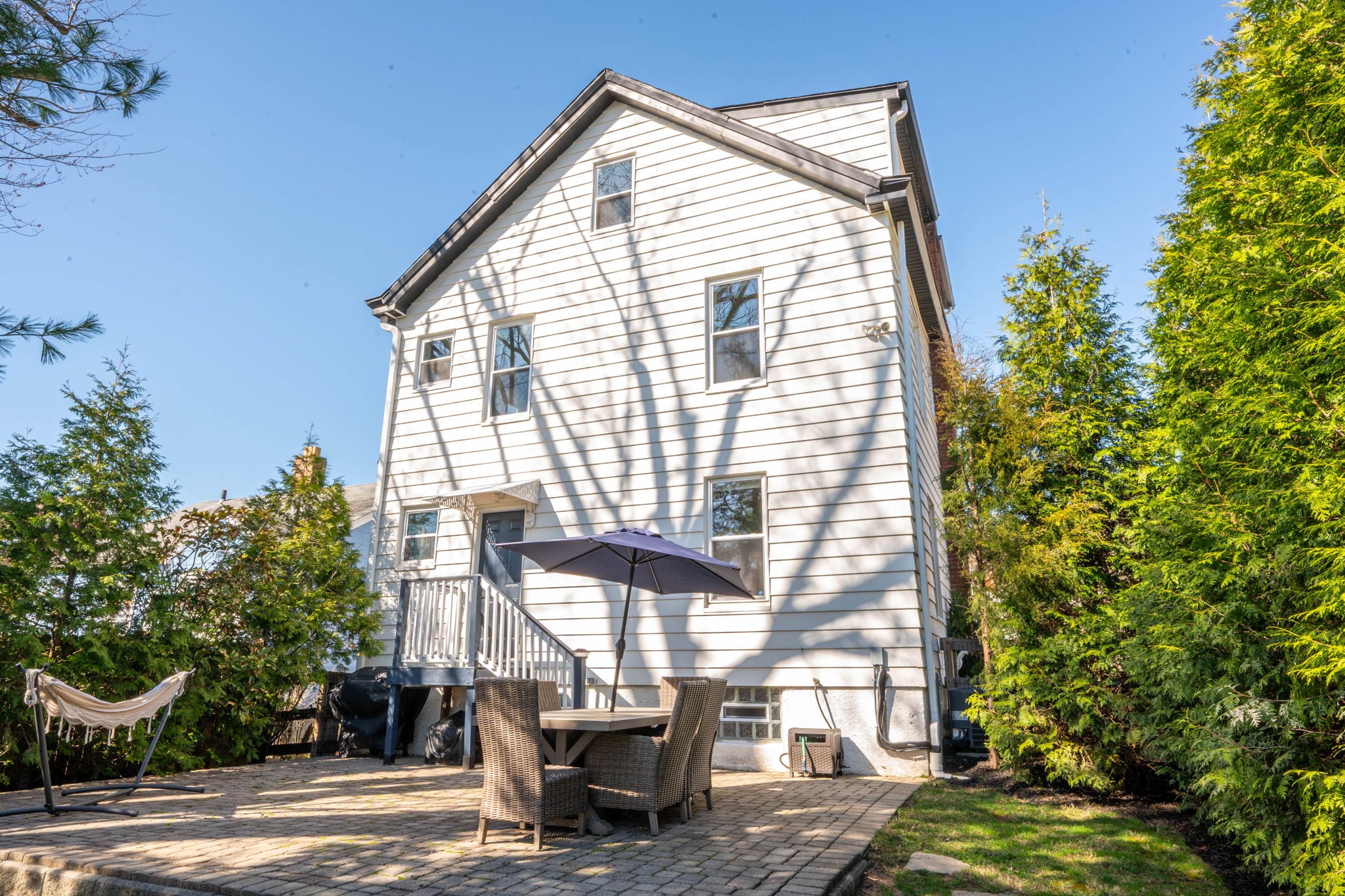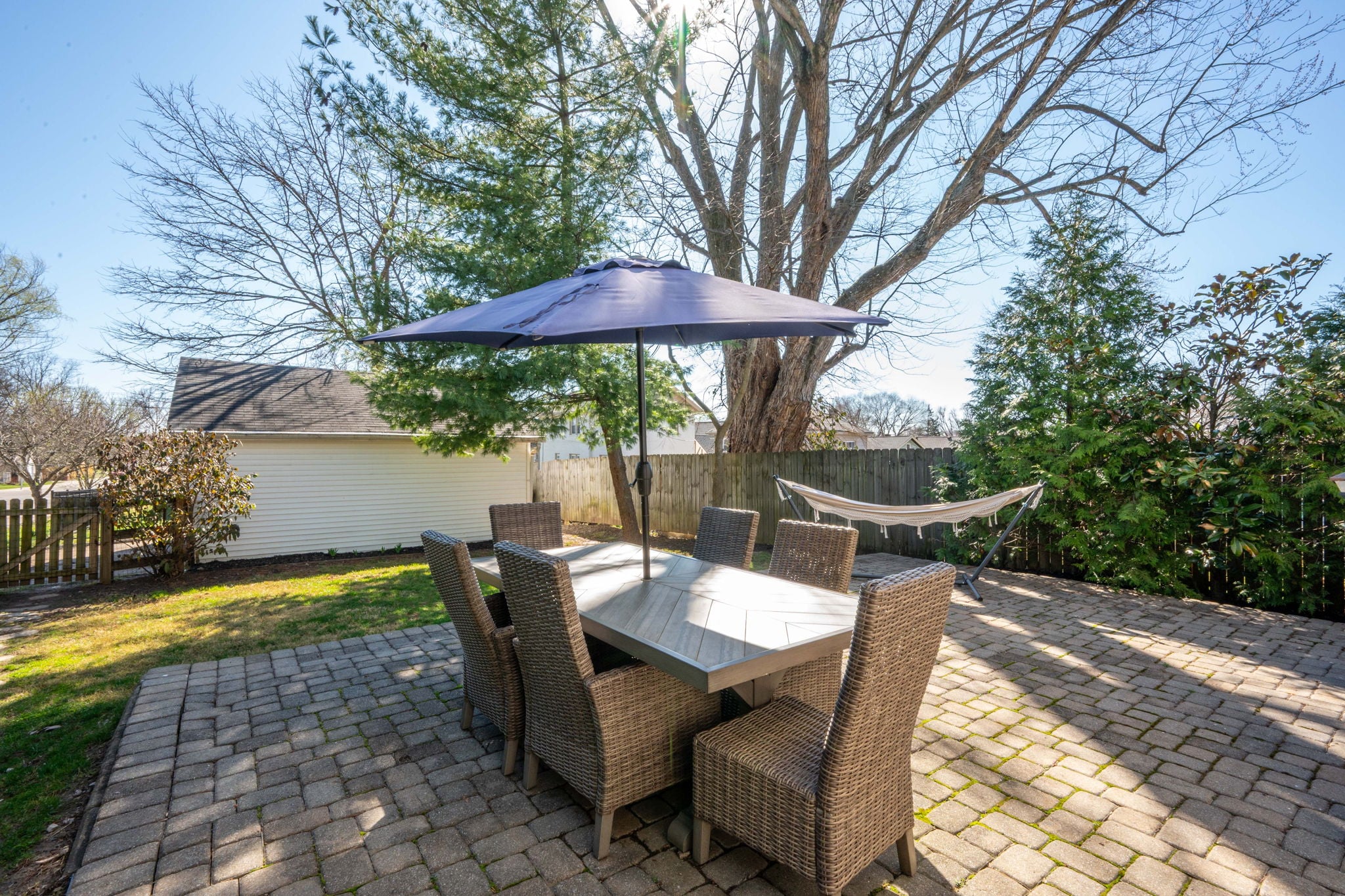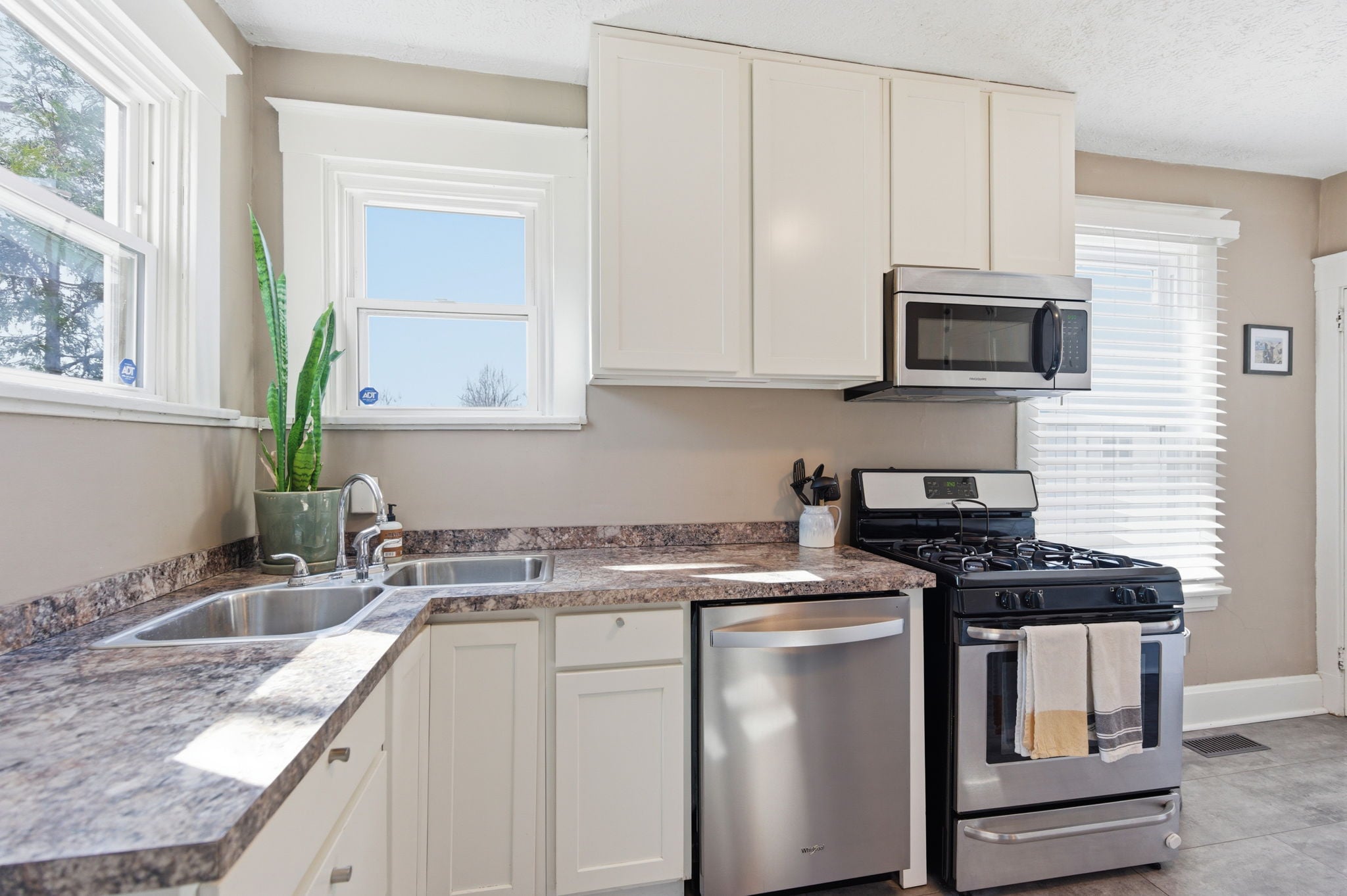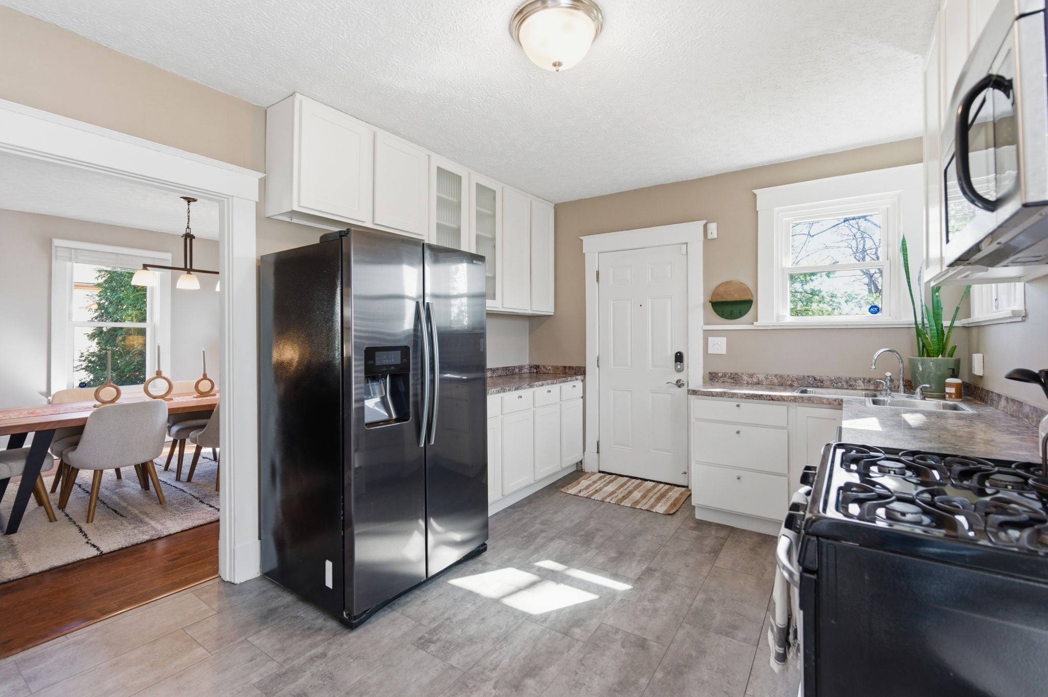 The spacious kitchen features modern appliances, walks out to a peaceful, fenced backyard with green space for gardens, plus a paved patio ready for seating, fire pits, hammocks & parties with friends.