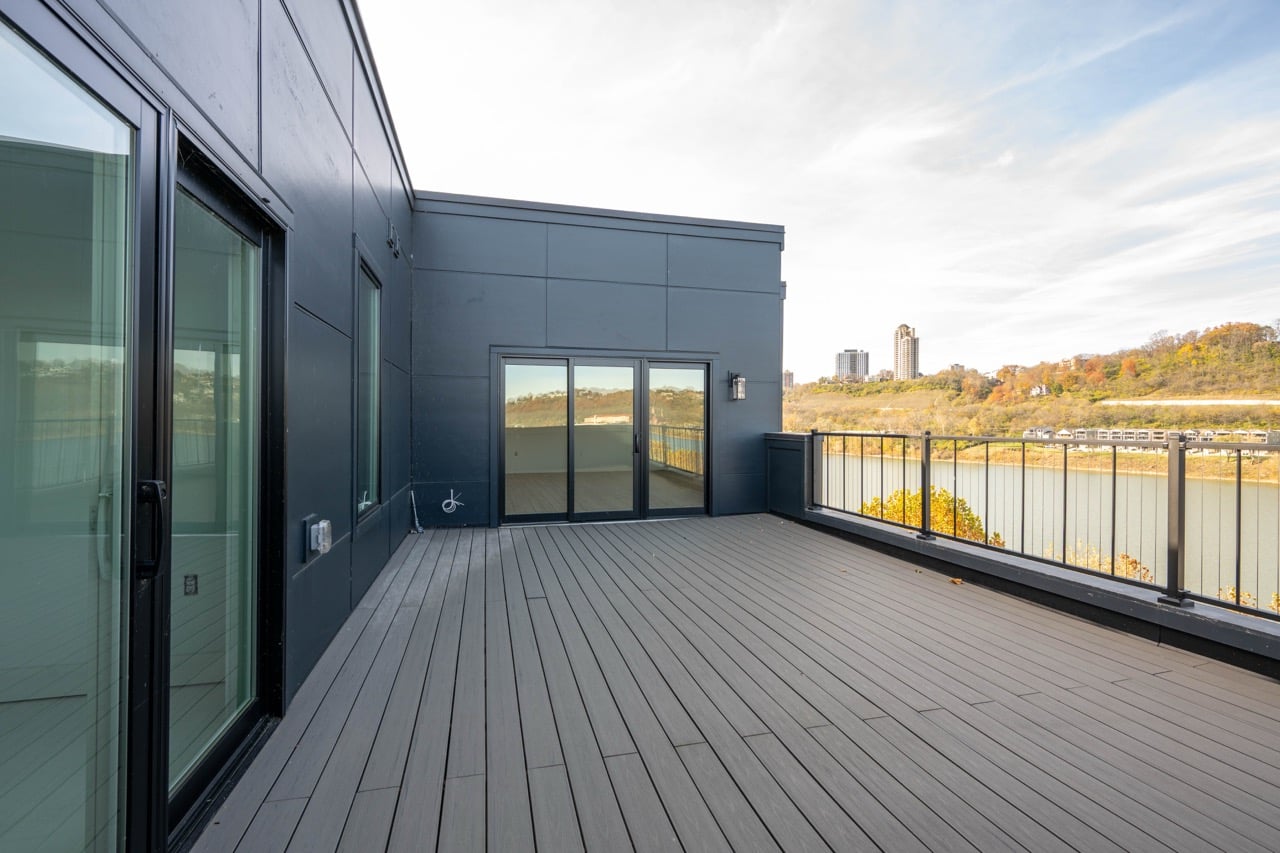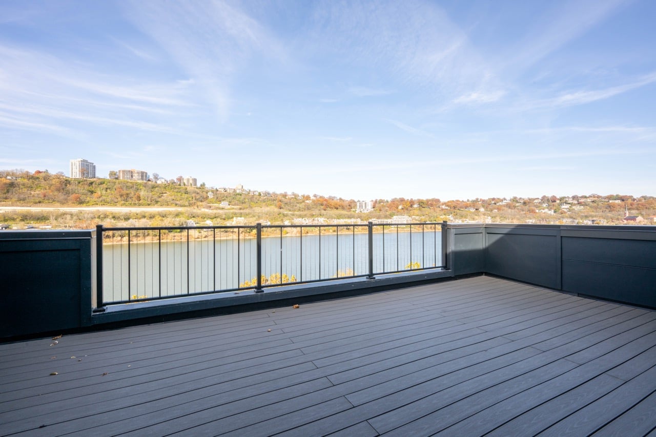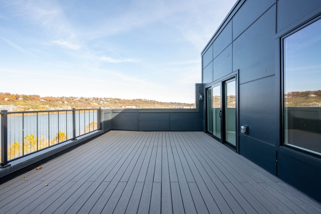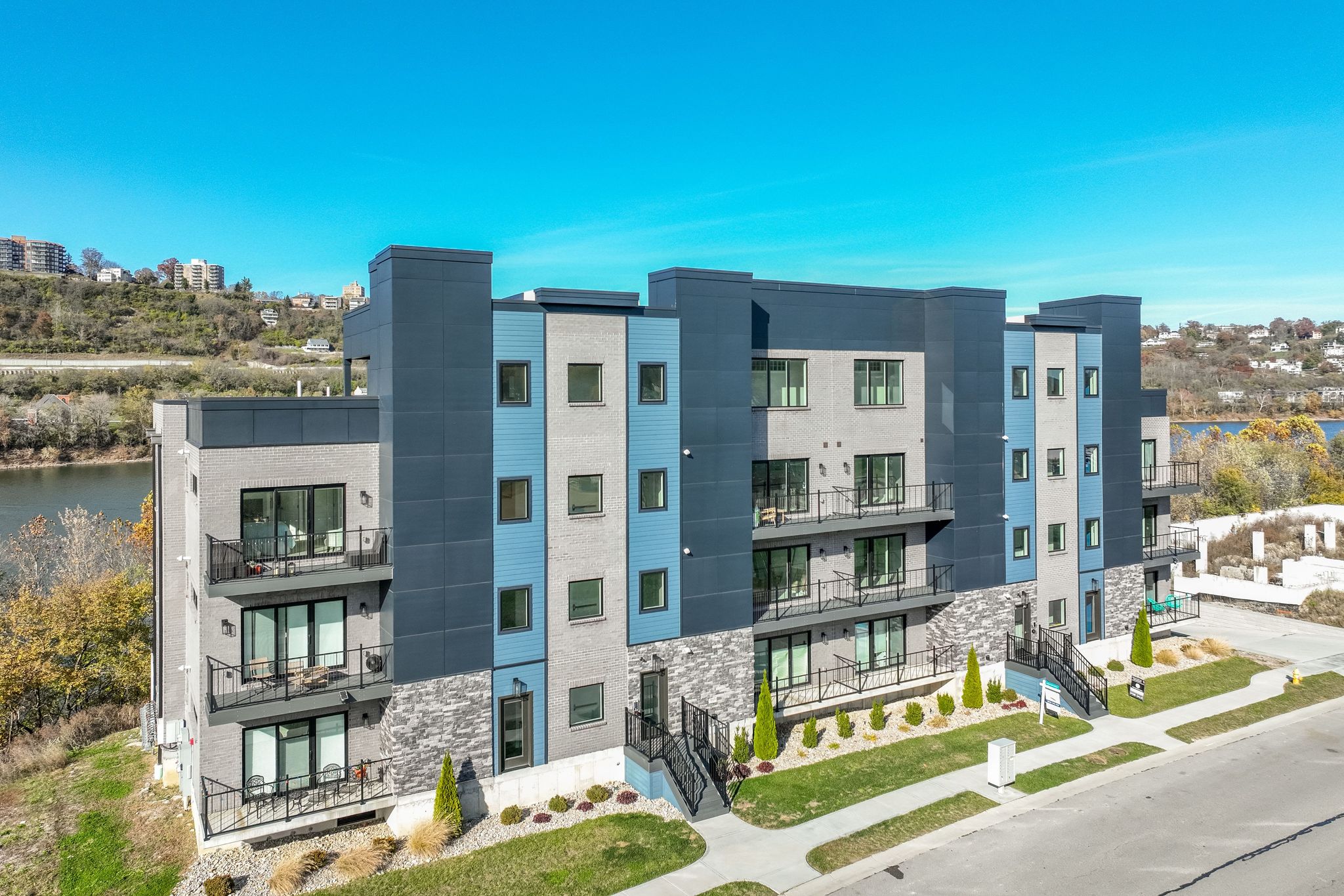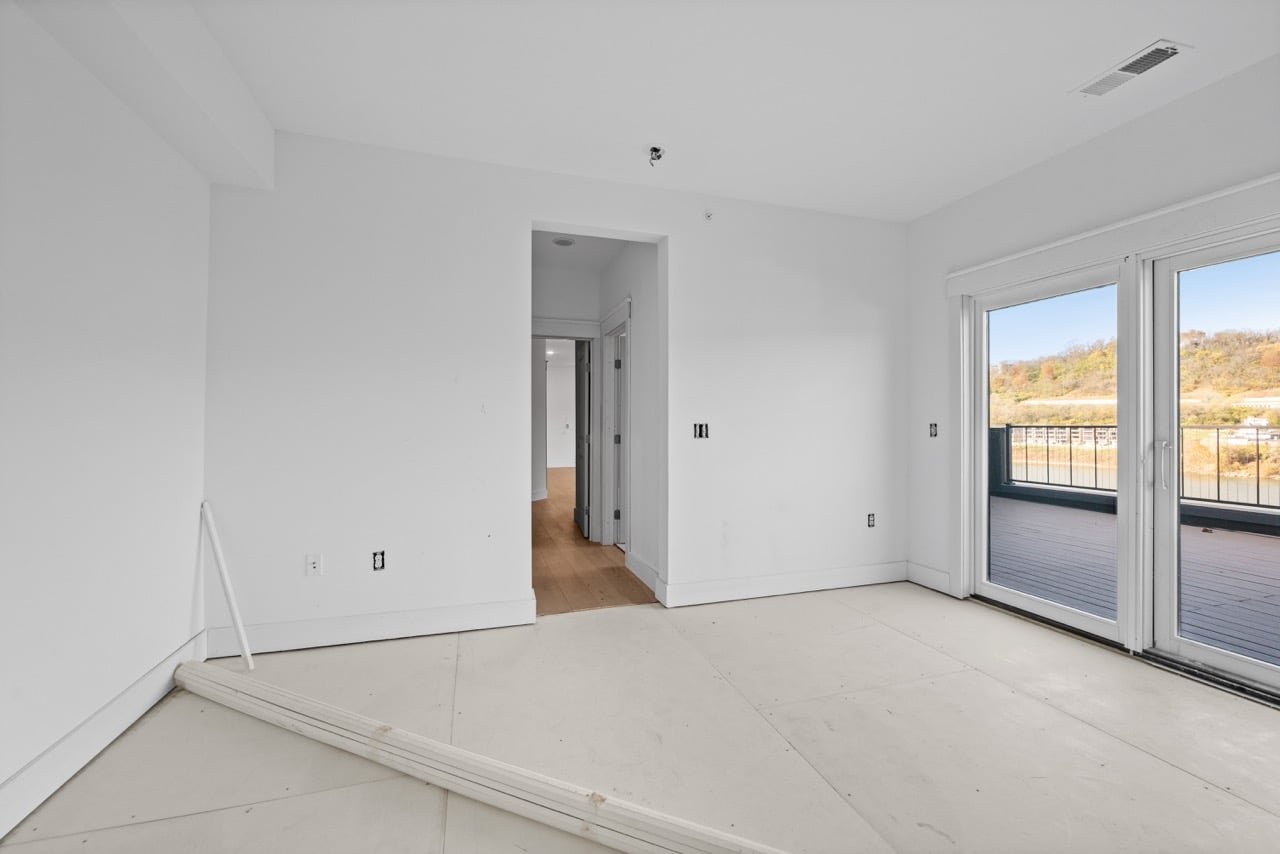 Unit 403 is one of only two penthouses on the fourth floor, showcasing an expansive private balcony with sweeping river views. Finishing construction now, but you can already see the bright, open layout!