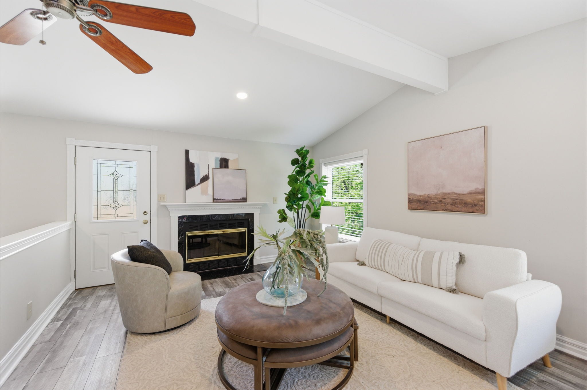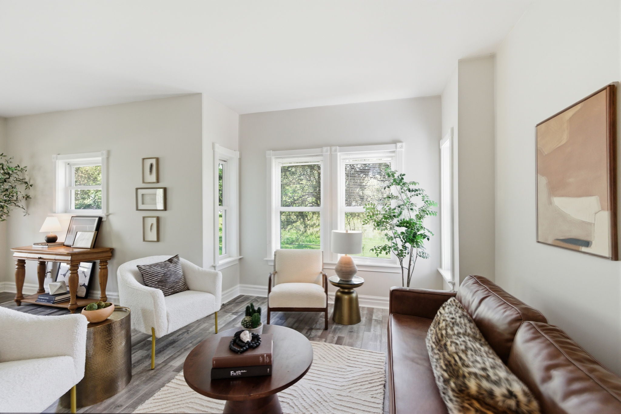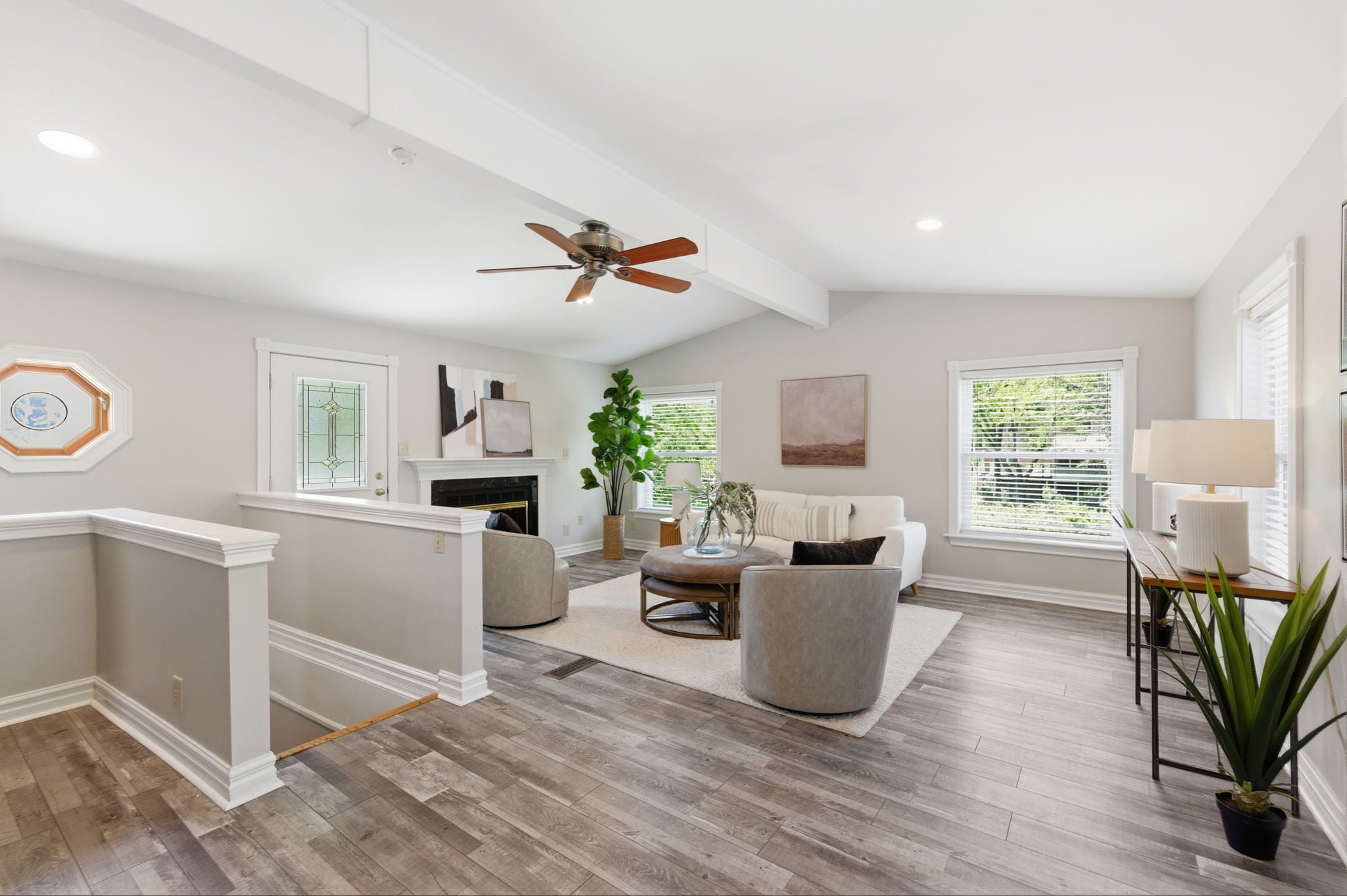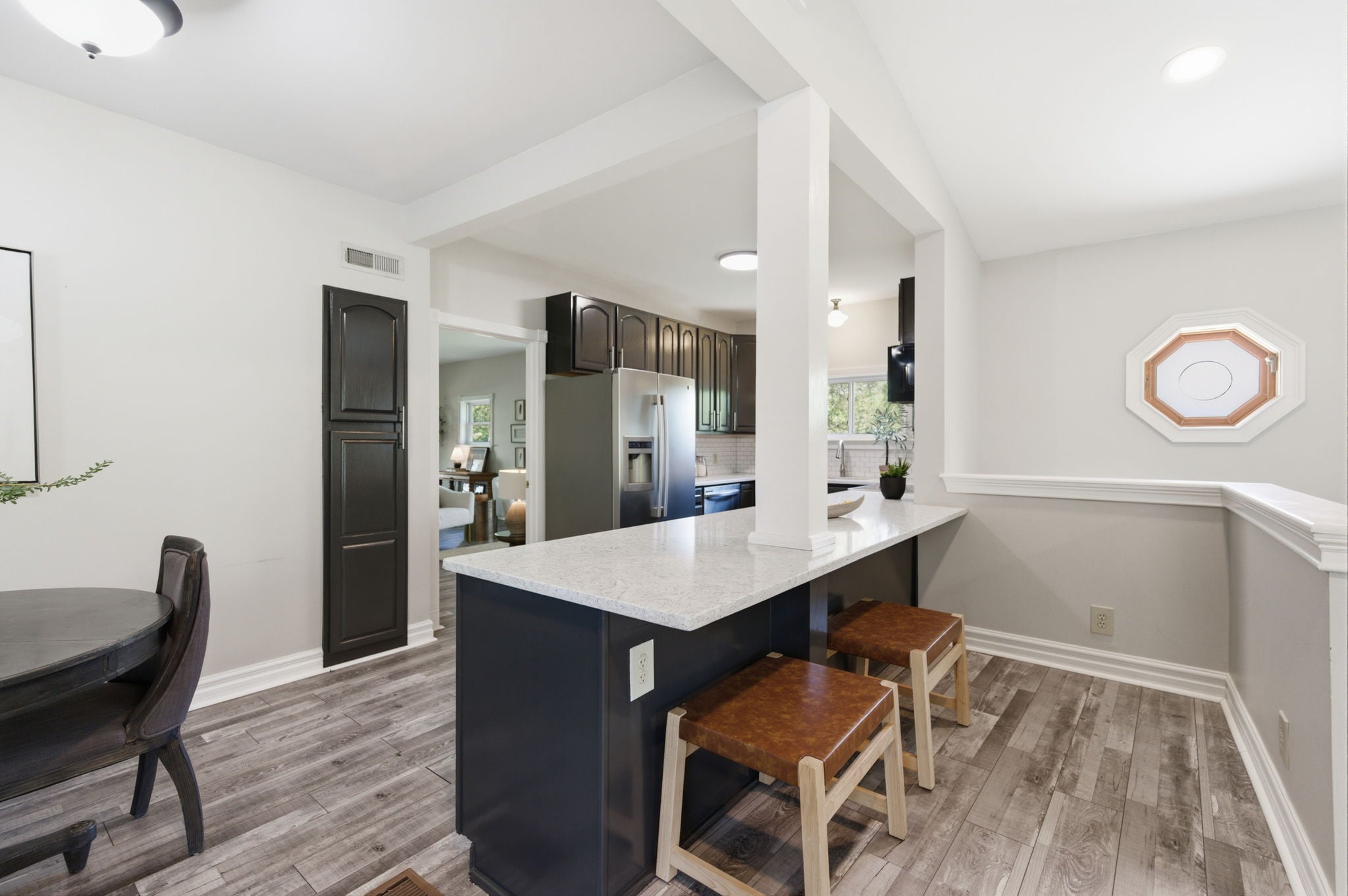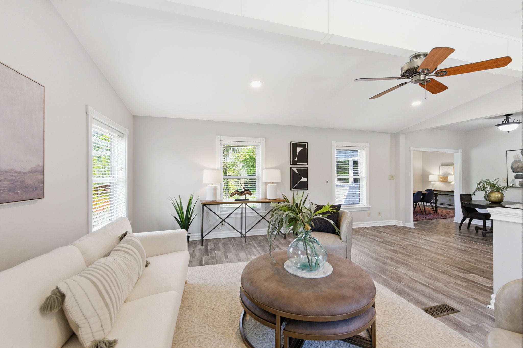 A warm and inviting family room flows into bright, airy interiors framed by walls of windows, along with a sun-drenched breakfast nook that feels perfect for slow mornings and casual gatherings.